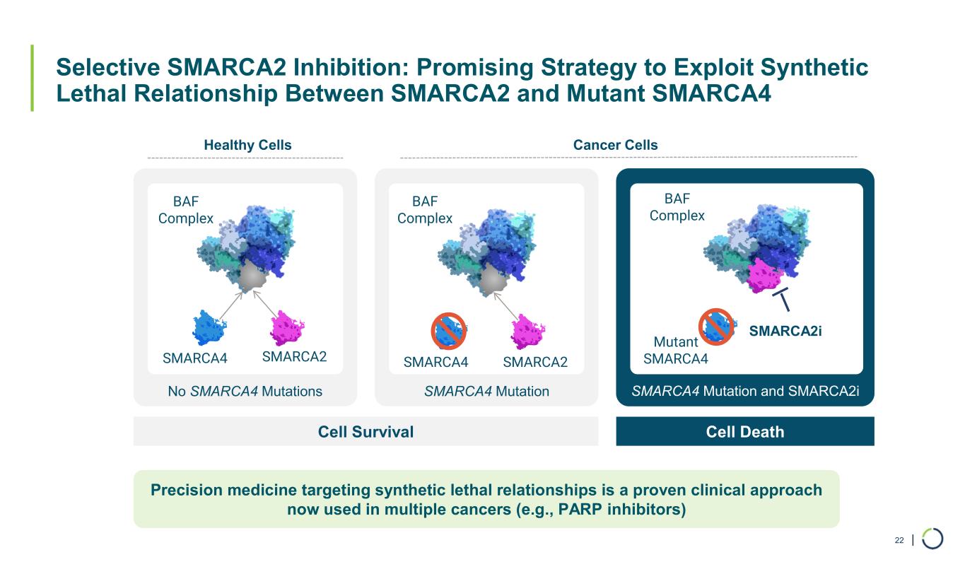 | Selective SMARCA2 Inhibition: Promising Strategy to Exploit Synthetic Lethal Relationship Between SMARCA2 and Mutant SMARCA4 22 No SMARCA4 Mutations SMARCA4 Mutation SMARCA4 Mutation and SMARCA2i Cell Survival Cell Death Healthy Cells Cancer Cells SMARCA4 SMARCA2 BAF Complex BAF Complex Mutant SMARCA4 BAF Complex SMARCA2i Precision medicine targeting synthetic lethal relationships is a proven clinical approach now used in multiple cancers (e.g., PARP inhibitors) SMARCA4 SMARCA2