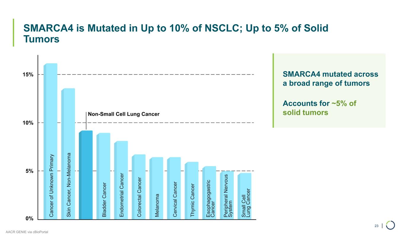 | SMARCA4 is Mutated in Up to 10% of NSCLC; Up to 5% of Solid Tumors 23 SMARCA4 mutated across a broad range of tumors Accounts for ~5% of solid tumors AACR GENIE via cBioPortal