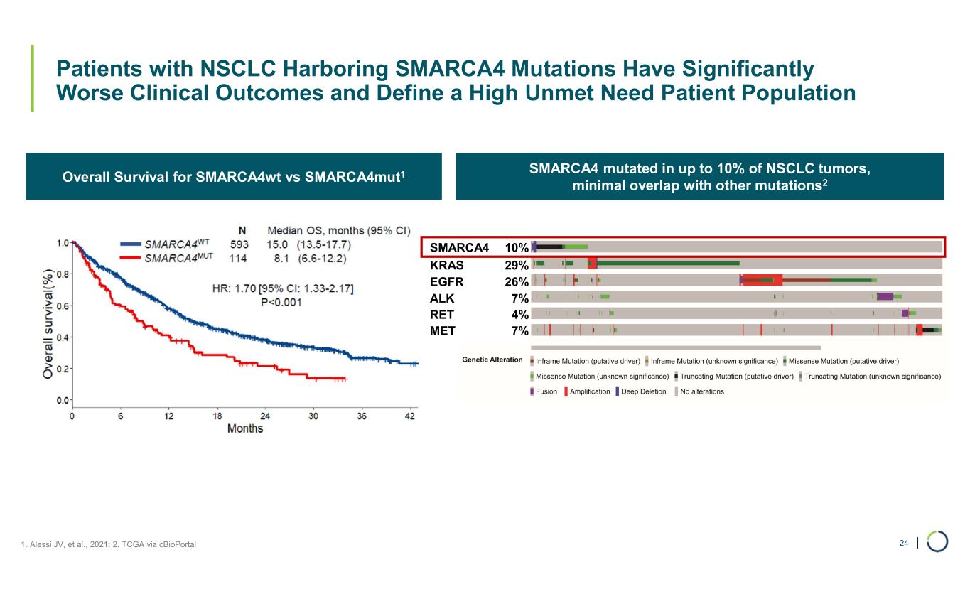 | SMARCA4 mutated in up to 10% of NSCLC tumors, minimal overlap with other mutations2Overall Survival for SMARCA4wt vs SMARCA4mut1 Patients with NSCLC Harboring SMARCA4 Mutations Have Significantly Worse Clinical Outcomes and Define a High Unmet Need Patient Population 24 SMARCA4 10% KRAS 29% EGFR 26% ALK 7% RET 4% MET 7% 1. Alessi JV, et al., 2021; 2. TCGA via cBioPortal