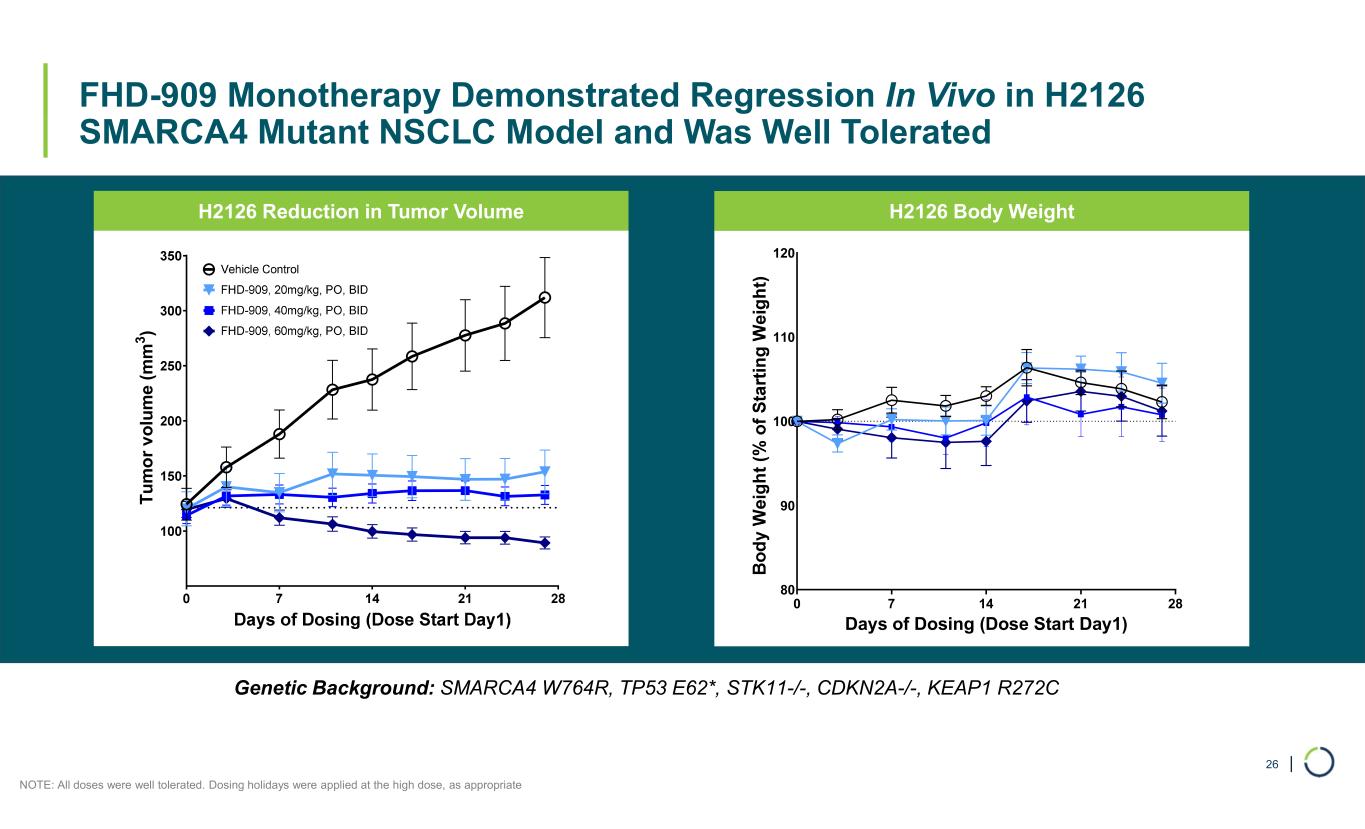 | SMARCA4 WT SMARCA4 MUT 0.0001 0.001 0.01 0.1 1 A b so lu te I C 50 ( μ M ) NCI-H2122 CALU6 NCI-H2172 NCI-H441 NCI-H2170 NCI-H460 NCI-H1703 NCI-H358 NCI-H2009 NCI-H1944 NCI-H1299 A549 RERFLCAI NCI-H1693 NCI-H1568 NCI-H2023 NCI-H838 SMARCA4 (WT) SMARCA4 (MUT) (SMARCA2 Only)(SMARCA2 & SMARCA4) FHD-909 Demonstrated Approximately 33-fold Selectivity Across 17 SMARCA4 Mutant and Wild-Type Cell Lines In Vivo 25 Spread in potency for wild type versus mutant cell lines indicates 33-fold selectivity observed Selectivity = 33x Median IC50 (µM) 0.0932SMARCA4 WT 0.0028SMARCA4 MUT