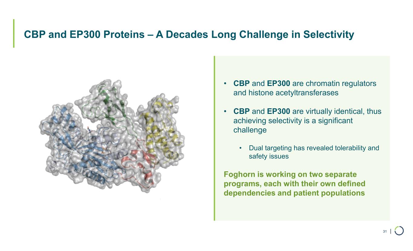 | CBP and EP300 Proteins – A Decades Long Challenge in Selectivity 31 • CBP and EP300 are chromatin regulators and histone acetyltransferases • CBP and EP300 are virtually identical, thus achieving selectivity is a significant challenge • Dual targeting has revealed tolerability and safety issues Foghorn is working on two separate programs, each with their own defined dependencies and patient populations