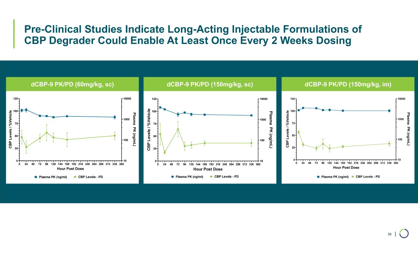 | Pre-Clinical Studies Indicate Long-Acting Injectable Formulations of CBP Degrader Could Enable At Least Once Every 2 Weeks Dosing 36 dCBP-9 PK/PD (60mg/kg, sc) dCBP-9 PK/PD (150mg/kg, sc) dCBP-9 PK/PD (150mg/kg, im) C B P L e ve ls / % V e h ic le P la s m a P K (n g /m L )