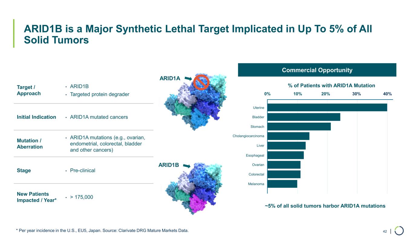 | ARID1B is a Major Synthetic Lethal Target Implicated in Up To 5% of All Solid Tumors 42* Per year incidence in the U.S., EU5, Japan. Source: Clarivate DRG Mature Markets Data. • ARID1B • Targeted protein degrader Target / Approach • ARID1A mutated cancersInitial Indication • ARID1A mutations (e.g., ovarian, endometrial, colorectal, bladder and other cancers) Mutation / Aberration • Pre-clinicalStage • > 175,000 New Patients Impacted / Year* ARID1A ARID1B ~5% of all solid tumors harbor ARID1A mutations Uterine Bladder Stomach Cholangiocarcinoma Liver Esophageal Ovarian Colorectal Melanoma 0% 10% 20% 30% 40% Commercial Opportunity % of Patients with ARID1A Mutation