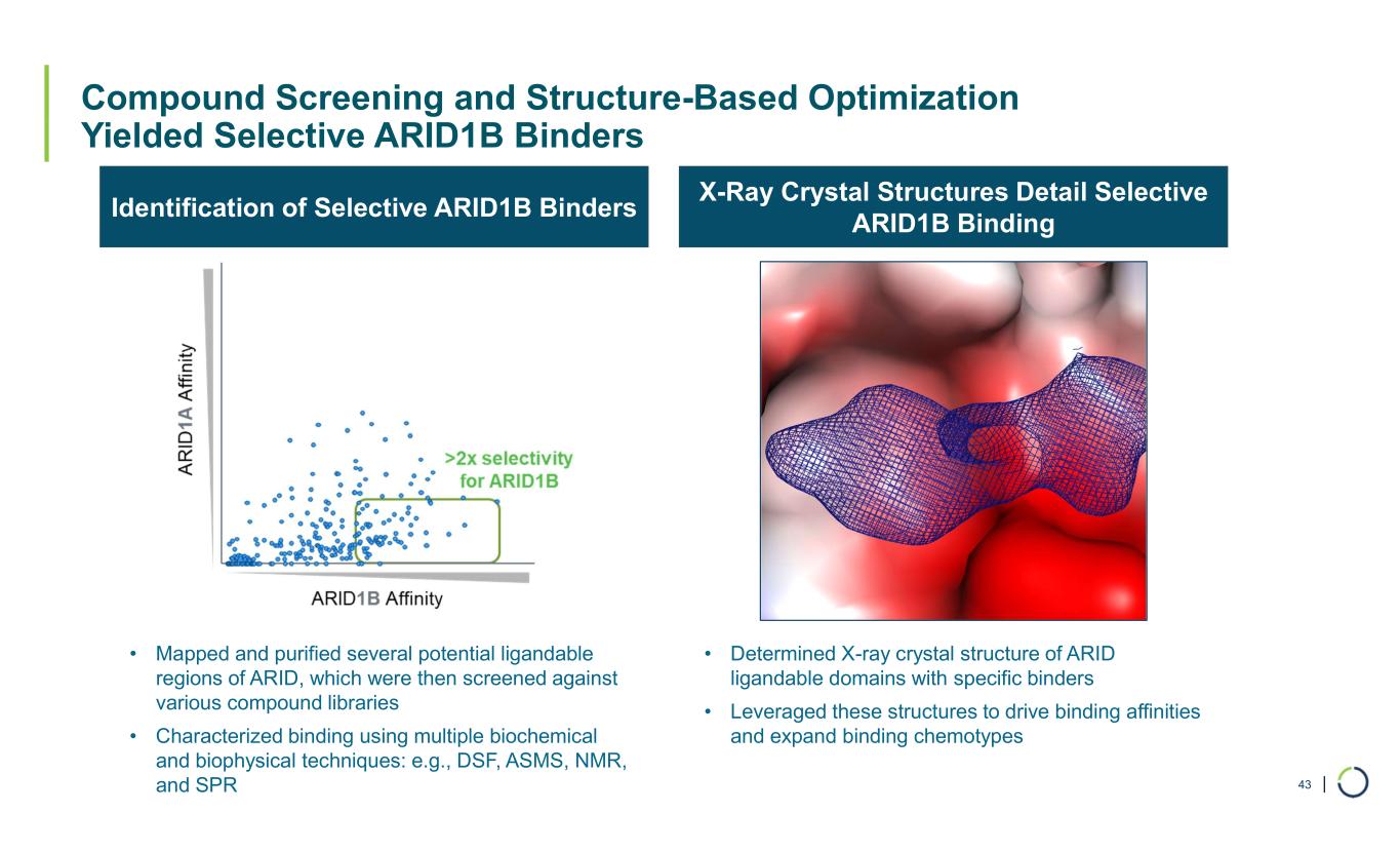 | Compound Screening and Structure-Based Optimization Yielded Selective ARID1B Binders 43 • Mapped and purified several potential ligandable regions of ARID, which were then screened against various compound libraries • Characterized binding using multiple biochemical and biophysical techniques: e.g., DSF, ASMS, NMR, and SPR • Determined X-ray crystal structure of ARID ligandable domains with specific binders • Leveraged these structures to drive binding affinities and expand binding chemotypes Identification of Selective ARID1B Binders X-Ray Crystal Structures Detail Selective ARID1B Binding