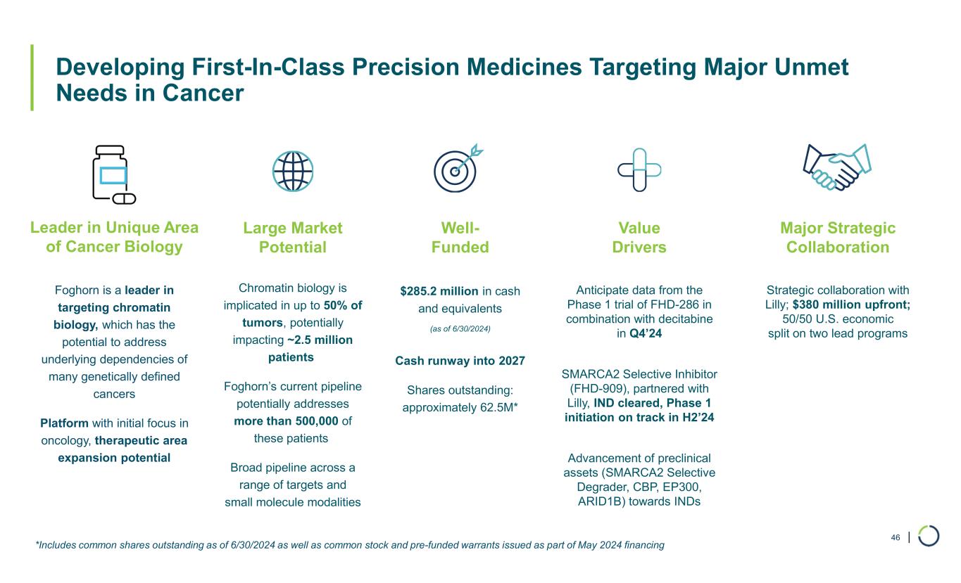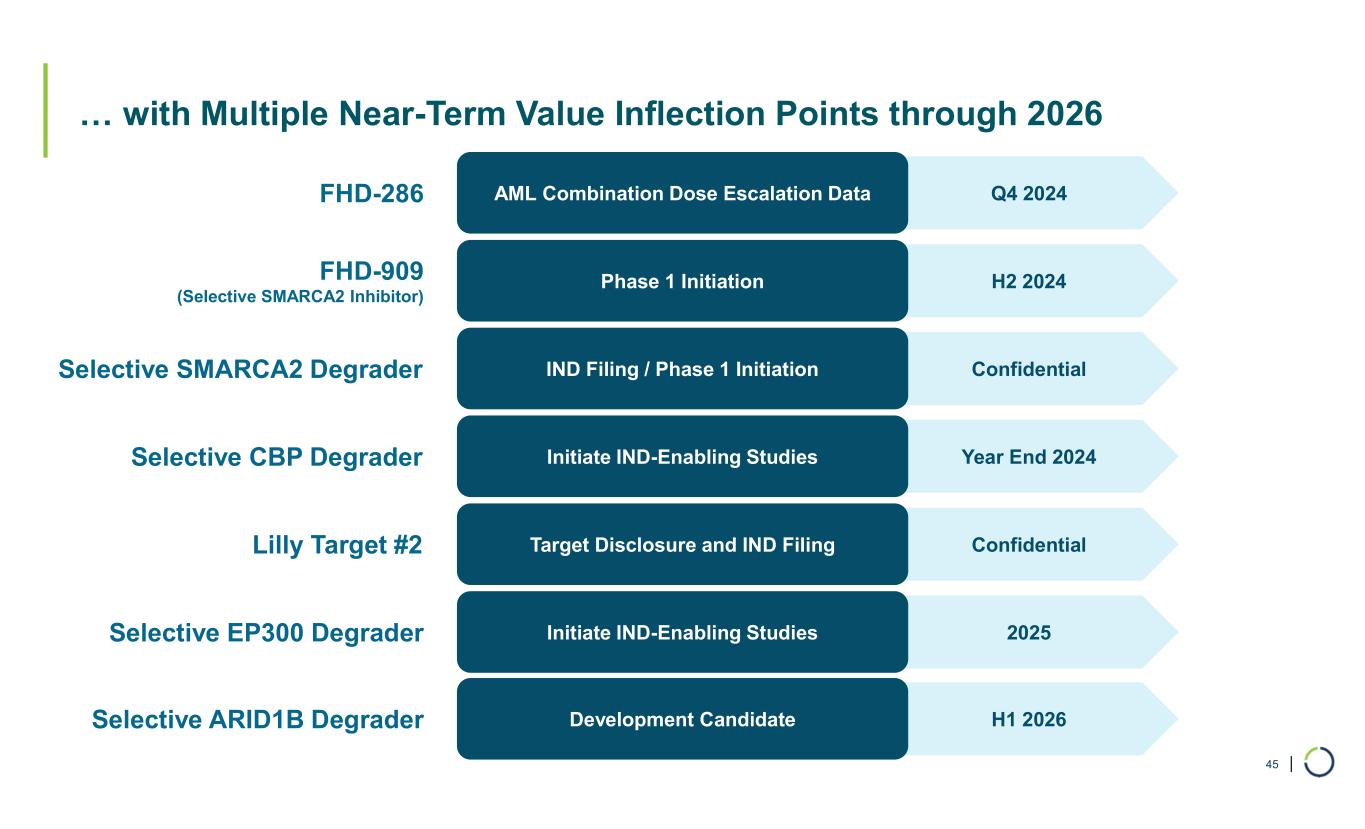 | … with Multiple Near-Term Value Inflection Points through 2026 45 Q4 2024AML Combination Dose Escalation Data FHD-286 H2 2024Phase 1 InitiationFHD-909 (Selective SMARCA2 Inhibitor) ConfidentialIND Filing / Phase 1 InitiationSelective SMARCA2 Degrader Year End 2024Initiate IND-Enabling StudiesSelective CBP Degrader 2025Initiate IND-Enabling StudiesSelective EP300 Degrader ConfidentialTarget Disclosure and IND FilingLilly Target #2 H1 2026Development CandidateSelective ARID1B Degrader