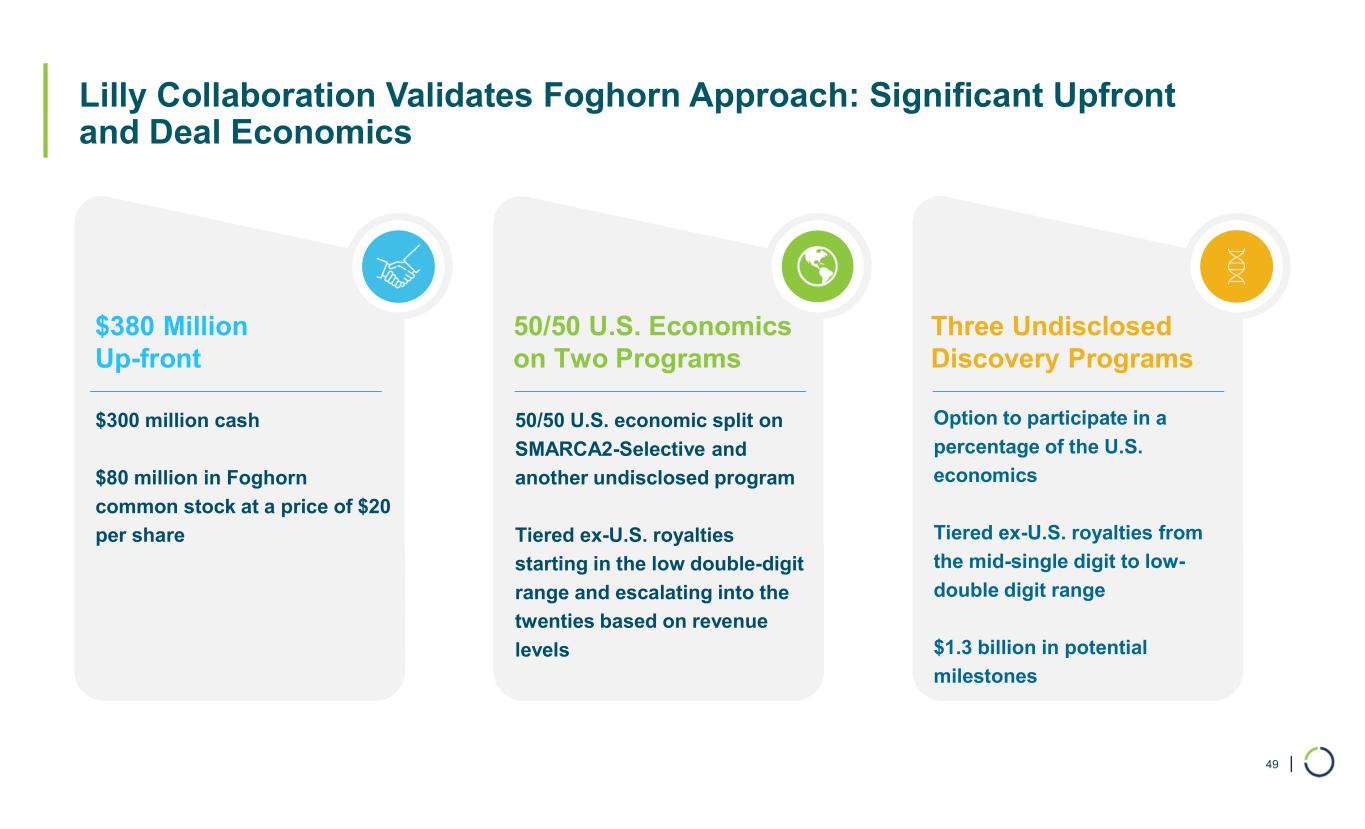 | Lilly Collaboration Validates Foghorn Approach: Significant Upfront and Deal Economics 49 $380 Million Up-front $300 million cash $80 million in Foghorn common stock at a price of $20 per share Three Undisclosed Discovery Programs Option to participate in a percentage of the U.S. economics Tiered ex-U.S. royalties from the mid-single digit to low- double digit range $1.3 billion in potential milestones 50/50 U.S. Economics on Two Programs 50/50 U.S. economic split on SMARCA2-Selective and another undisclosed program Tiered ex-U.S. royalties starting in the low double-digit range and escalating into the twenties based on revenue levels