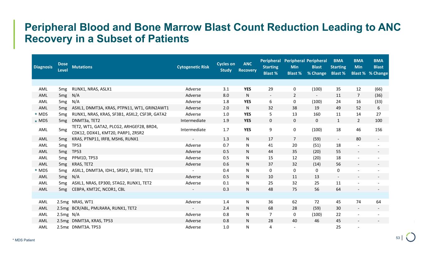 | Peripheral Blood and Bone Marrow Blast Count Reduction Leading to ANC Recovery in a Subset of Patients 53 * MDS Patient Diagnosis Dose Level Mutations Cytogenetic Risk Cycles on Study ANC Recovery Peripheral Starting Blast % Peripheral Min Blast % Peripheral Blast % Change BMA Starting Blast % BMA Min Blast % BMA Blast % Change AML 5mg RUNX1, NRAS, ASLX1 Adverse 3.1 YES 29 0 (100) 35 12 (66) AML 5mg N/A Adverse 8.0 N - 2 - 11 7 (36) AML 5mg N/A Adverse 1.8 YES 6 0 (100) 24 16 (33) AML 5mg ASXL1, DNMT3A, KRAS, PTPN11, WT1, GRIN2AWT1 Adverse 2.0 N 32 38 19 49 52 6 MDS 5mg RUNX1, NRAS, KRAS, SF3B1, ASXL2, CSF3R, GATA2 Adverse 1.0 YES 5 13 160 11 14 27 MDS 5mg DNMT3a, TET2 Intermediate 1.9 YES 0 0 0 1 2 100 AML 5mg TET2, WT1, GATA2, PLCG2, ARHGEF28, BRD4, CDK12, DDX41, KMT20, PARP1, ZRSR2 Intermediate 1.7 YES 9 0 (100) 18 46 156 AML 5mg KRAS, PTNP11, IRF8, MSH6, RUNX1 - 1.3 N 17 7 (59) - 80 - AML 5mg TP53 Adverse 0.7 N 41 20 (51) 18 - - AML 5mg TP53 Adverse 0.5 N 44 35 (20) 55 - - AML 5mg PPM1D, TP53 Adverse 0.5 N 15 12 (20) 18 - - AML 5mg KRAS, TET2 Adverse 0.6 N 37 32 (14) 56 - - MDS 5mg ASXL1, DNMT3A, IDH1, SRSF2, SF3B1, TET2 - 0.4 N 0 0 0 0 - - AML 5mg N/A Adverse 0.5 N 10 11 13 - - - AML 5mg ASXL1, NRAS, EP300, STAG2, RUNX1, TET2 Adverse 0.1 N 25 32 25 11 - - AML 5mg CEBPA, KMT2C, NCOR1, CBL - 0.3 N 48 75 56 64 - - AML 2.5mg NRAS, WT1 Adverse 1.4 N 36 62 72 45 74 64 AML 2.5mg BCR/ABL, PMLRARA, RUNX1, TET2 - 2.4 N 68 28 (59) 30 - - AML 2.5mg N/A Adverse 0.8 N 7 0 (100) 22 - - AML 2.5mg DNMT3A, KRAS, TP53 Adverse 0.8 N 28 40 46 45 - - AML 2.5mg DNMT3A, TP53 Adverse 1.0 N 4 - 25 - * * *