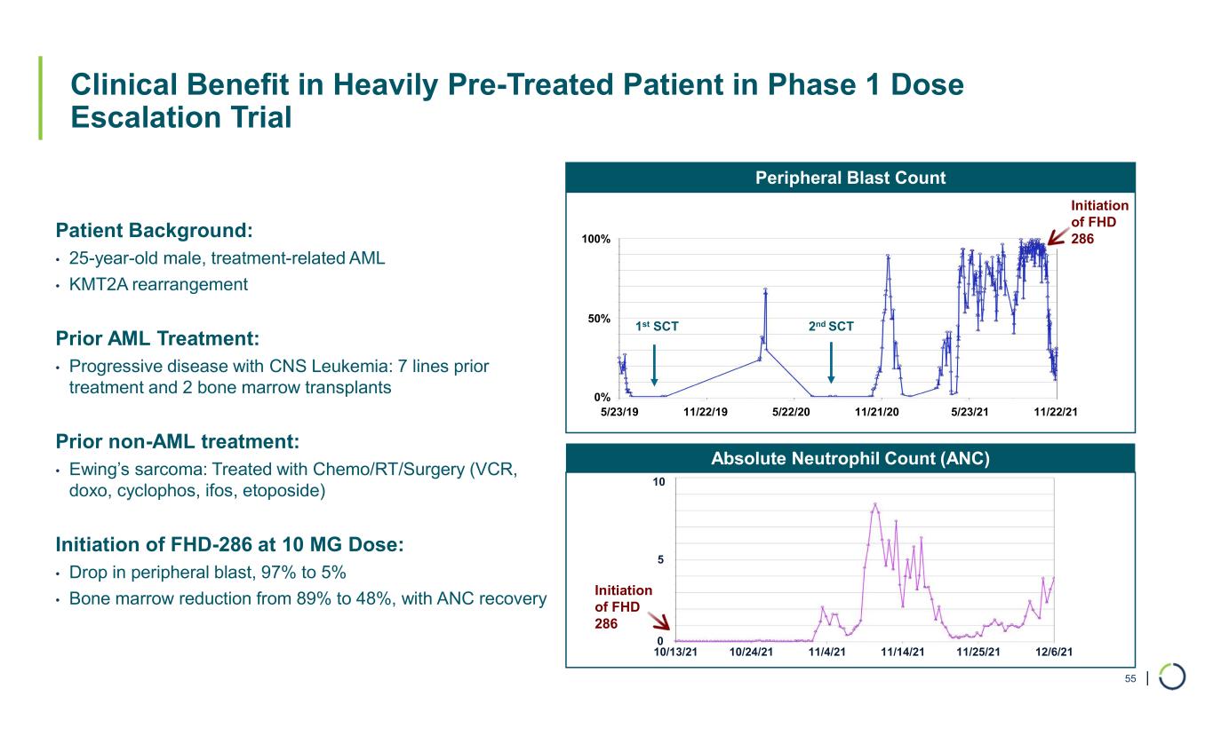 | Absolute Neutrophil Count (ANC) Peripheral Blast Count Clinical Benefit in Heavily Pre-Treated Patient in Phase 1 Dose Escalation Trial 55 100% 0% 50% 10 5 10/13/21 10/24/21 11/4/21 11/14/21 11/25/21 12/6/21 0 Initiation of FHD 286 1st SCT 2nd SCT Patient Background: • 25-year-old male, treatment-related AML • KMT2A rearrangement Prior AML Treatment: • Progressive disease with CNS Leukemia: 7 lines prior treatment and 2 bone marrow transplants Prior non-AML treatment: • Ewing’s sarcoma: Treated with Chemo/RT/Surgery (VCR, doxo, cyclophos, ifos, etoposide) Initiation of FHD-286 at 10 MG Dose: • Drop in peripheral blast, 97% to 5% • Bone marrow reduction from 89% to 48%, with ANC recovery 5/23/19 11/22/19 5/22/20 5/23/2111/21/20 11/22/21 Initiation of FHD 286