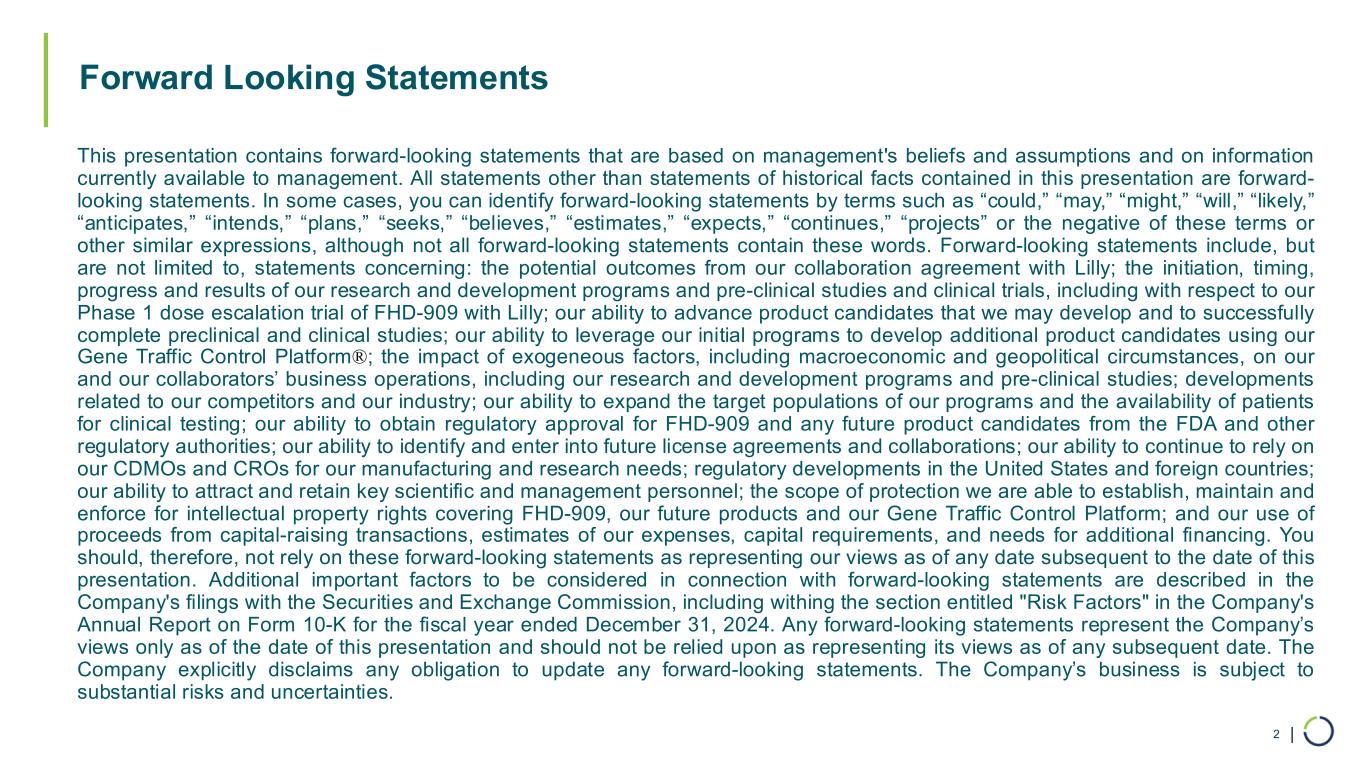 | Forward Looking Statements 2 This presentation contains forward-looking statements that are based on management's beliefs and assumptions and on information currently available to management. All statements other than statements of historical facts contained in this presentation are forward- looking statements. In some cases, you can identify forward-looking statements by terms such as “could,” “may,” “might,” “will,” “likely,” “anticipates,” “intends,” “plans,” “seeks,” “believes,” “estimates,” “expects,” “continues,” “projects” or the negative of these terms or other similar expressions, although not all forward-looking statements contain these words. Forward-looking statements include, but are not limited to, statements concerning: the potential outcomes from our collaboration agreement with Lilly; the initiation, timing, progress and results of our research and development programs and pre-clinical studies and clinical trials, including with respect to our Phase 1 dose escalation trial of FHD-909 with Lilly; our ability to advance product candidates that we may develop and to successfully complete preclinical and clinical studies; our ability to leverage our initial programs to develop additional product candidates using our Gene Traffic Control Platform®; the impact of exogeneous factors, including macroeconomic and geopolitical circumstances, on our and our collaborators’ business operations, including our research and development programs and pre-clinical studies; developments related to our competitors and our industry; our ability to expand the target populations of our programs and the availability of patients for clinical testing; our ability to obtain regulatory approval for FHD-909 and any future product candidates from the FDA and other regulatory authorities; our ability to identify and enter into future license agreements and collaborations; our ability to continue to rely on our CDMOs and CROs for our manufacturing and research needs; regulatory developments in the United States and foreign countries; our ability to attract and retain key scientific and management personnel; the scope of protection we are able to establish, maintain and enforce for intellectual property rights covering FHD-909, our future products and our Gene Traffic Control Platform; and our use of proceeds from capital-raising transactions, estimates of our expenses, capital requirements, and needs for additional financing. You should, therefore, not rely on these forward-looking statements as representing our views as of any date subsequent to the date of this presentation. Additional important factors to be considered in connection with forward-looking statements are described in the Company's filings with the Securities and Exchange Commission, including withing the section entitled "Risk Factors" in the Company's Annual Report on Form 10-K for the fiscal year ended December 31, 2024. Any forward-looking statements represent the Company’s views only as of the date of this presentation and should not be relied upon as representing its views as of any subsequent date. The Company explicitly disclaims any obligation to update any forward-looking statements. The Company’s business is subject to substantial risks and uncertainties.
