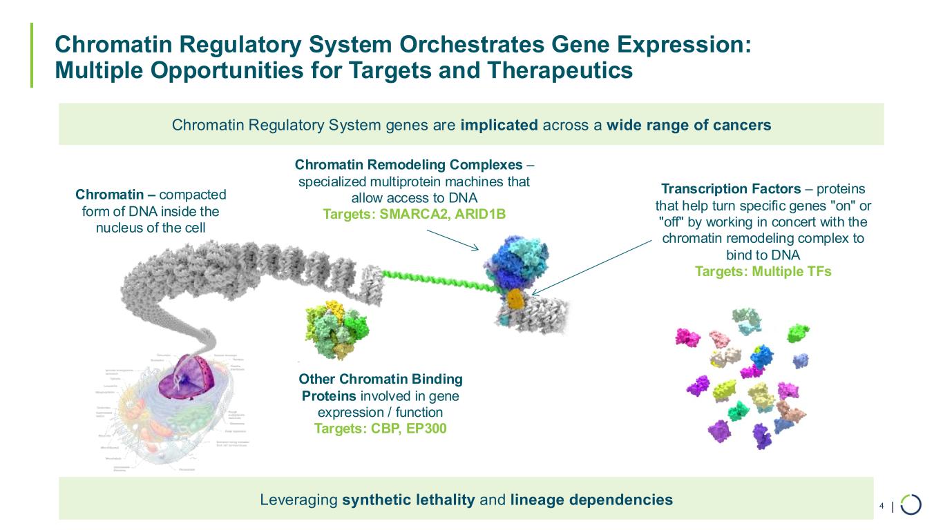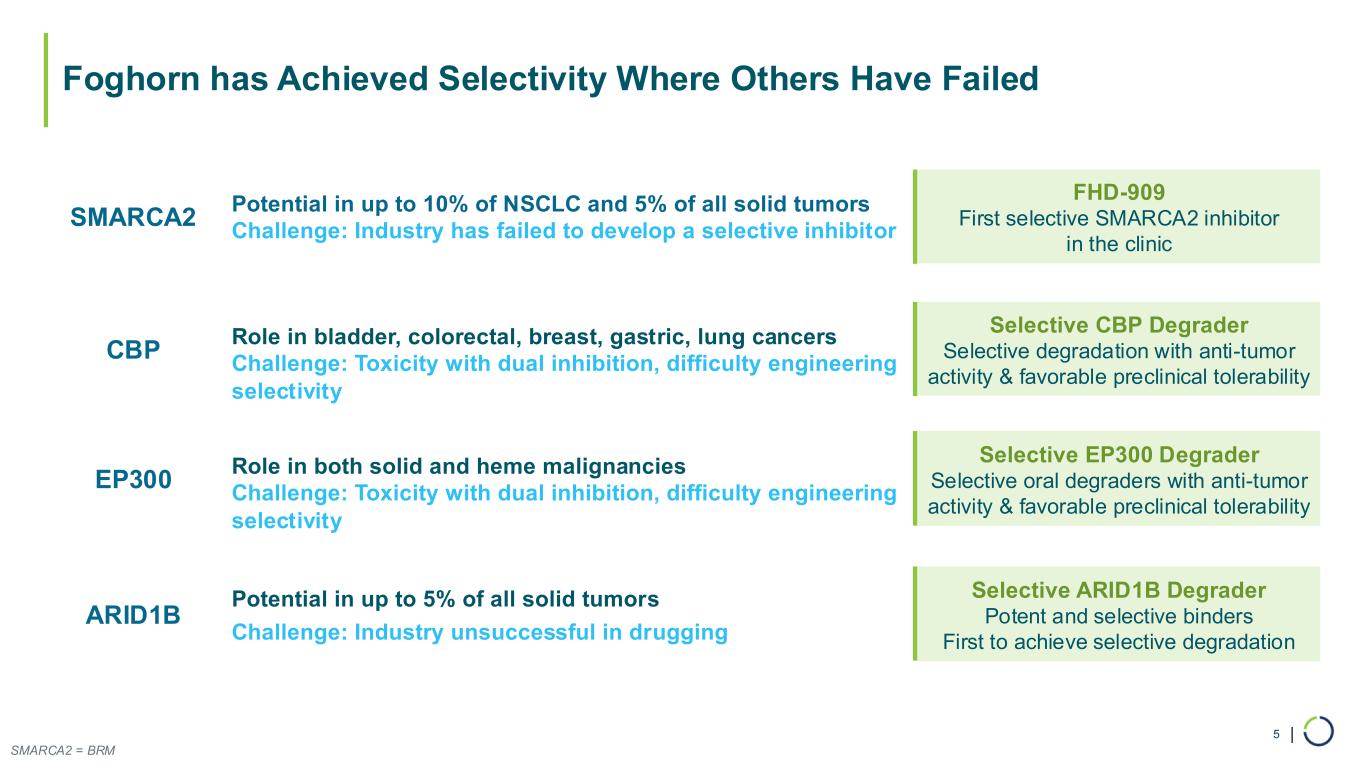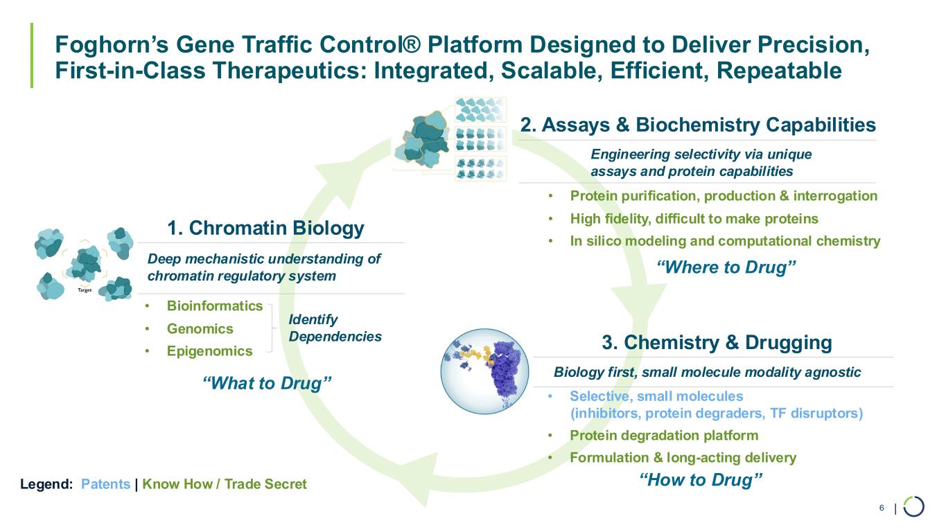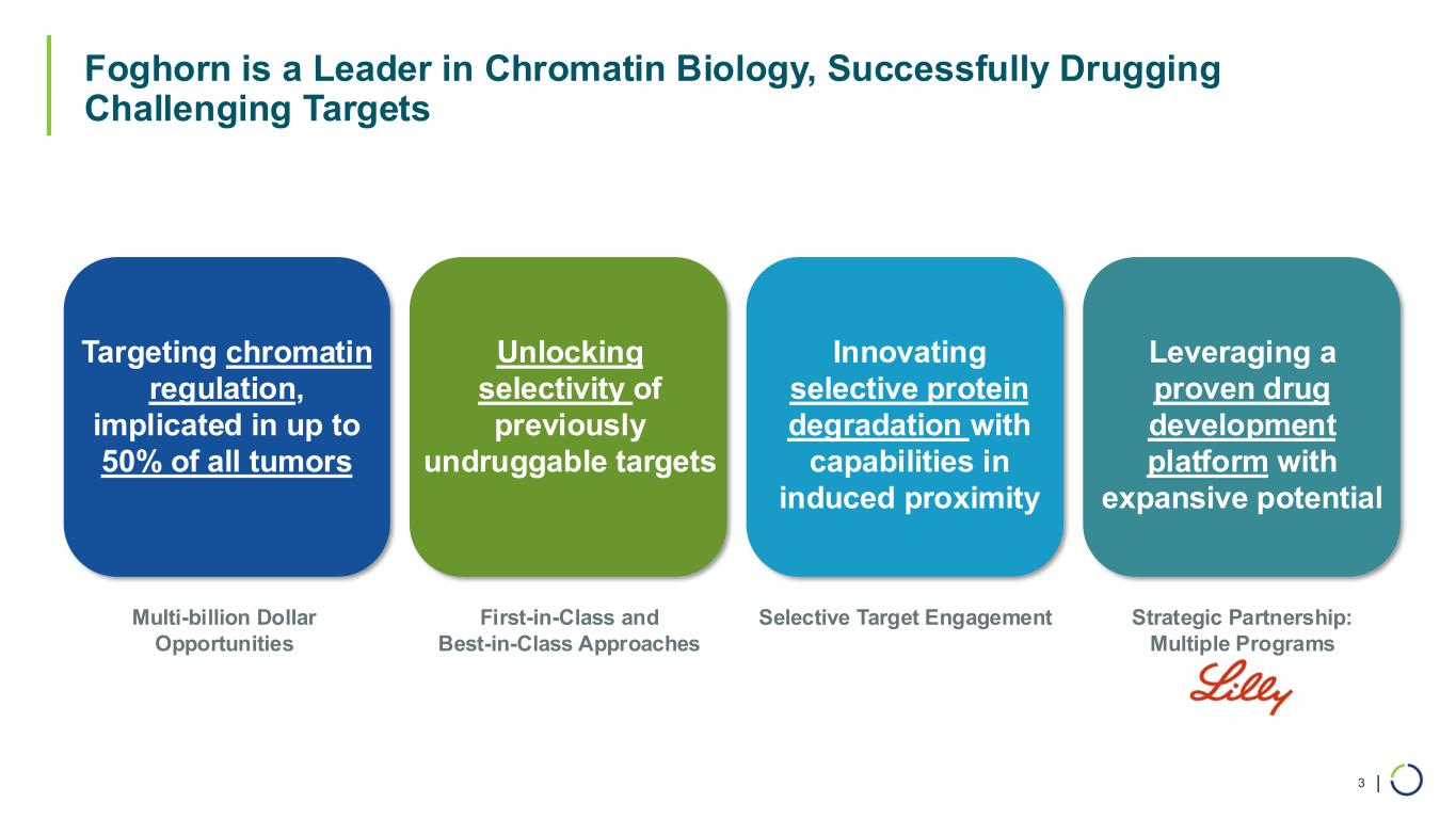 | Foghorn is a Leader in Chromatin Biology, Successfully Drugging Challenging Targets 3 Multi-billion Dollar Opportunities First-in-Class and Best-in-Class Approaches Selective Target Engagement Strategic Partnership: Multiple Programs Targeting chromatin regulation, implicated in up to 50% of all tumors Unlocking selectivity of previously undruggable targets Innovating selective protein degradation with capabilities in induced proximity Leveraging a proven drug development platform with expansive potential