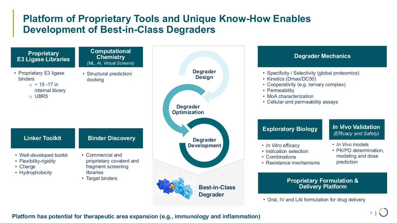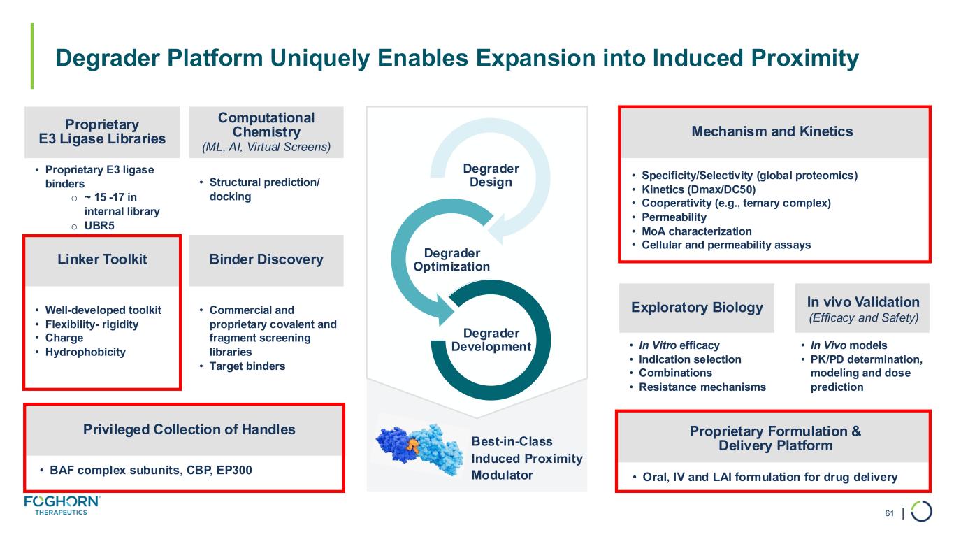 | Degrader Design Degrader Optimization Degrader Development Best-in-Class Induced Proximity Modulator • Structural prediction/ docking • Well-developed toolkit • Flexibility- rigidity • Charge • Hydrophobicity • Commercial and proprietary covalent and fragment screening libraries • Target binders • Oral, IV and LAI formulation for drug delivery Computational Chemistry (ML, AI, Virtual Screens) Proprietary E3 Ligase Libraries Binder DiscoveryLinker Toolkit Mechanism and Kinetics Exploratory Biology In vivo Validation (Efficacy and Safety) Proprietary Formulation & Delivery Platform • BAF complex subunits, CBP, EP300 Privileged Collection of Handles Degrader Platform Uniquely Enables Expansion into Induced Proximity 61 • Proprietary E3 ligase binders o ~ 15 -17 in internal library o UBR5 • Specificity/Selectivity (global proteomics) • Kinetics (Dmax/DC50) • Cooperativity (e.g., ternary complex) • Permeability • MoA characterization • Cellular and permeability assays • In Vitro efficacy • Indication selection • Combinations • Resistance mechanisms • In Vivo models • PK/PD determination, modeling and dose prediction
