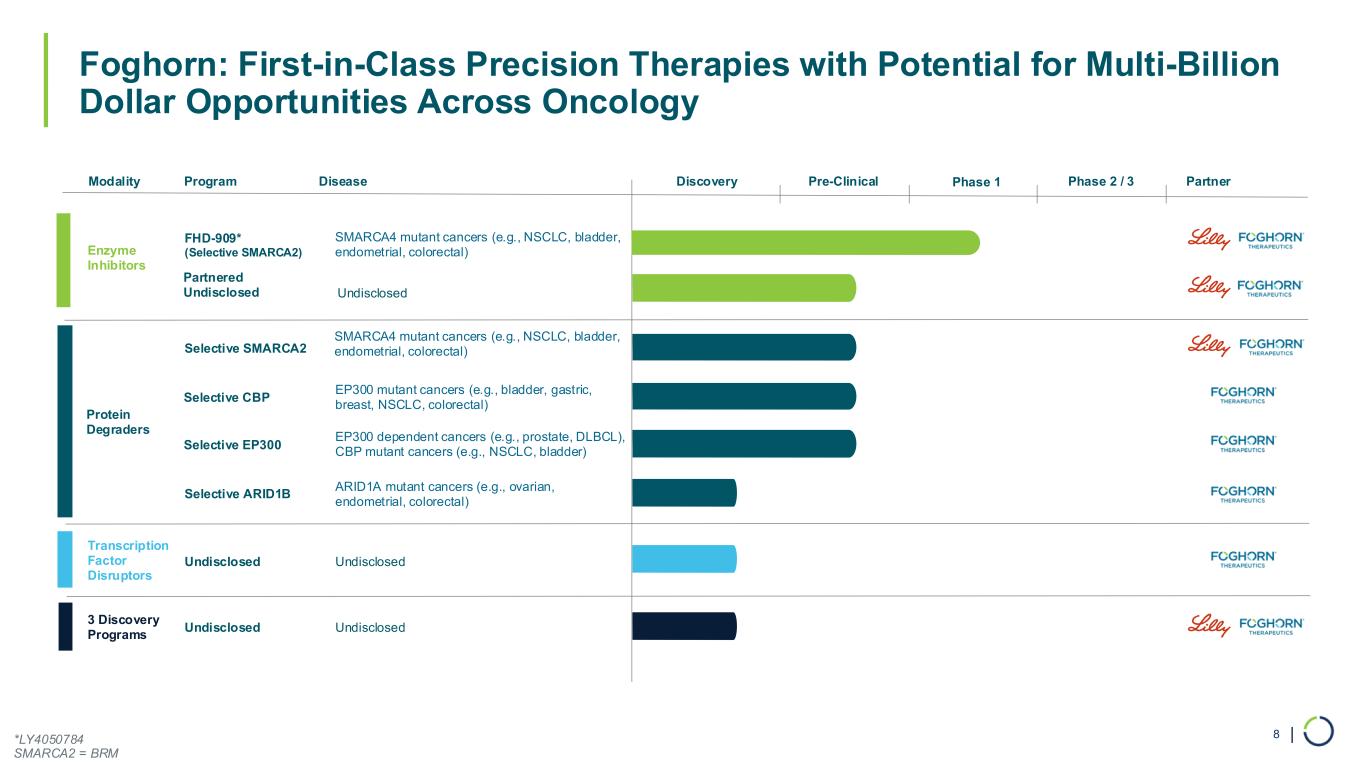 | Foghorn: First-in-Class Precision Therapies with Potential for Multi-Billion Dollar Opportunities Across Oncology 8 Modality Program Phase 1 Enzyme Inhibitors Transcription Factor Disruptors Undisclosed Protein Degraders Partner FHD-909* (Selective SMARCA2) 3 Discovery Programs Undisclosed Partnered Undisclosed Disease SMARCA4 mutant cancers (e.g., NSCLC, bladder, endometrial, colorectal) Selective SMARCA2 SMARCA4 mutant cancers (e.g., NSCLC, bladder, endometrial, colorectal) Selective ARID1B ARID1A mutant cancers (e.g., ovarian, endometrial, colorectal) Selective CBP EP300 mutant cancers (e.g., bladder, gastric, breast, NSCLC, colorectal) Selective EP300 EP300 dependent cancers (e.g., prostate, DLBCL), CBP mutant cancers (e.g., NSCLC, bladder) Undisclosed Undisclosed Undisclosed Pre-Clinical Phase 2 / 3Discovery *LY4050784 SMARCA2 = BRM