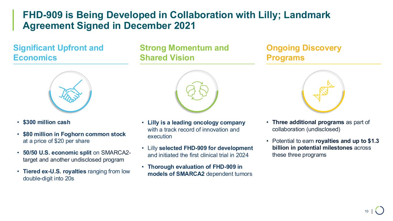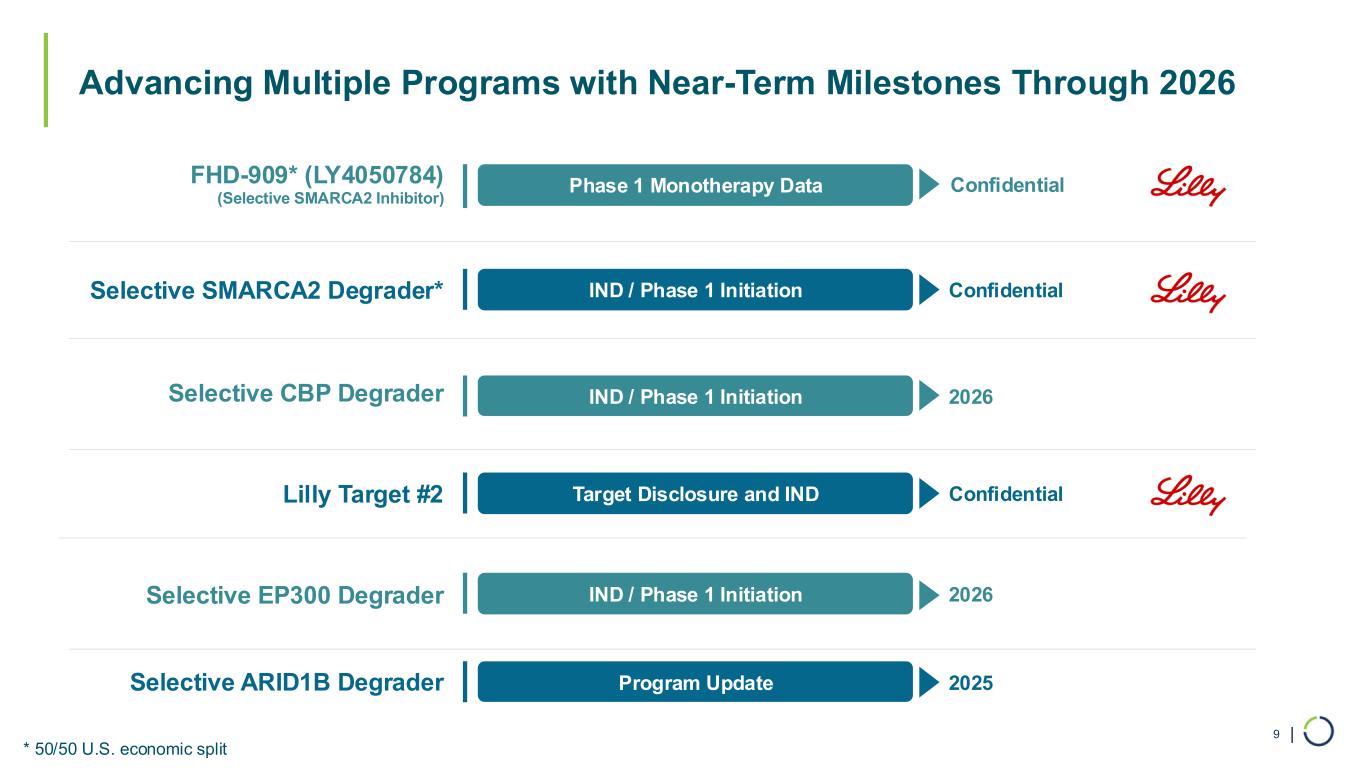 | Advancing Multiple Programs with Near-Term Milestones Through 2026 9 Phase 1 Monotherapy DataFHD-909* (LY4050784) (Selective SMARCA2 Inhibitor) 2026IND / Phase 1 InitiationSelective CBP Degrader 2026IND / Phase 1 InitiationSelective EP300 Degrader ConfidentialIND / Phase 1 InitiationSelective SMARCA2 Degrader* ConfidentialTarget Disclosure and INDLilly Target #2 2025Program UpdateSelective ARID1B Degrader * 50/50 U.S. economic split Confidential