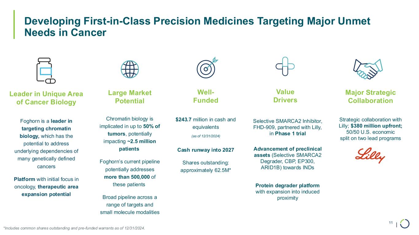 | FHD-909 is Being Developed in Collaboration with Lilly; Landmark Agreement Signed in December 2021 Significant Upfront and Economics Strong Momentum and Shared Vision Ongoing Discovery Programs • $300 million cash • $80 million in Foghorn common stock at a price of $20 per share • 50/50 U.S. economic split on SMARCA2- target and another undisclosed program • Tiered ex-U.S. royalties ranging from low double-digit into 20s • Lilly is a leading oncology company with a track record of innovation and execution • Lilly selected FHD-909 for development and initiated the first clinical trial in 2024 • Thorough evaluation of FHD-909 in models of SMARCA2 dependent tumors • Three additional programs as part of collaboration (undisclosed) • Potential to earn royalties and up to $1.3 billion in potential milestones across these three programs 10