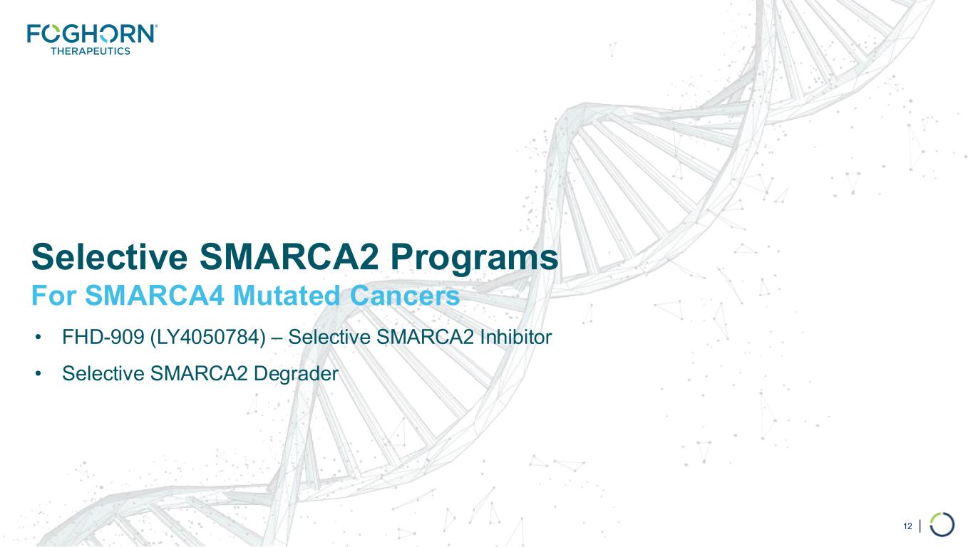 | Developing First-in-Class Precision Medicines Targeting Major Unmet Needs in Cancer 11 Large Market Potential Chromatin biology is implicated in up to 50% of tumors, potentially impacting ~2.5 million patients Foghorn’s current pipeline potentially addresses more than 500,000 of these patients Broad pipeline across a range of targets and small molecule modalities Major Strategic Collaboration Strategic collaboration with Lilly; $380 million upfront; 50/50 U.S. economic split on two lead programs Well- Funded $243.7 million in cash and equivalents (as of 12/31/2024) Cash runway into 2027 Shares outstanding: approximately 62.5M* Value Drivers Selective SMARCA2 Inhibitor, FHD-909, partnered with Lilly, in Phase 1 trial Advancement of preclinical assets (Selective SMARCA2 Degrader, CBP, EP300, ARID1B) towards INDs Protein degrader platform with expansion into induced proximity Leader in Unique Area of Cancer Biology Foghorn is a leader in targeting chromatin biology, which has the potential to address underlying dependencies of many genetically defined cancers Platform with initial focus in oncology, therapeutic area expansion potential *Includes common shares outstanding and pre-funded warrants as of 12/31/2024.