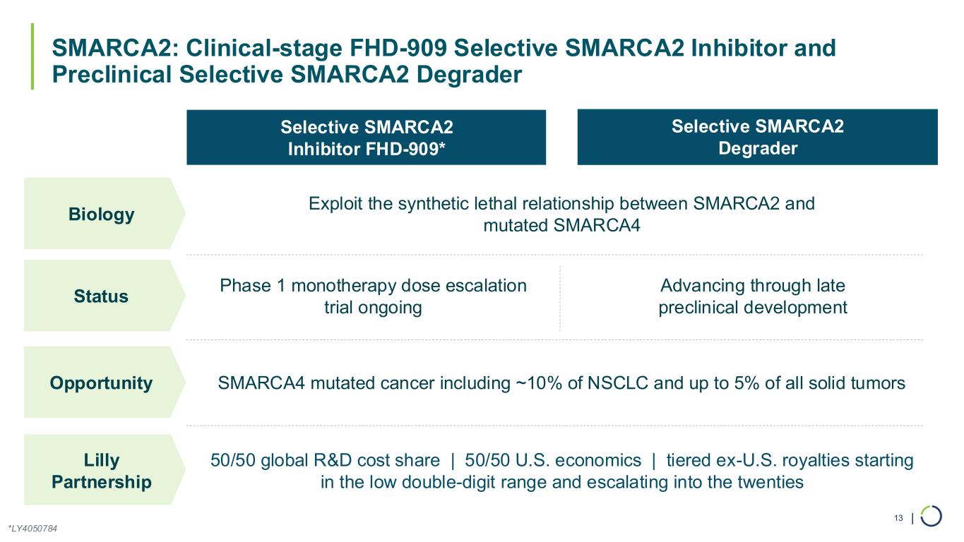 | SMARCA2: Clinical-stage FHD-909 Selective SMARCA2 Inhibitor and Preclinical Selective SMARCA2 Degrader 13 Selective SMARCA2 Inhibitor FHD-909* Selective SMARCA2 Degrader Biology Exploit the synthetic lethal relationship between SMARCA2 and mutated SMARCA4 Status Phase 1 monotherapy dose escalation trial ongoing Advancing through late preclinical development Opportunity SMARCA4 mutated cancer including ~10% of NSCLC and up to 5% of all solid tumors Lilly Partnership 50/50 global R&D cost share | 50/50 U.S. economics | tiered ex-U.S. royalties starting in the low double-digit range and escalating into the twenties *LY4050784