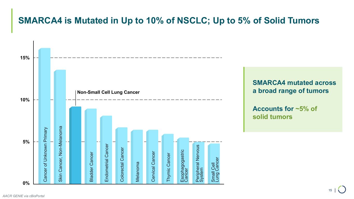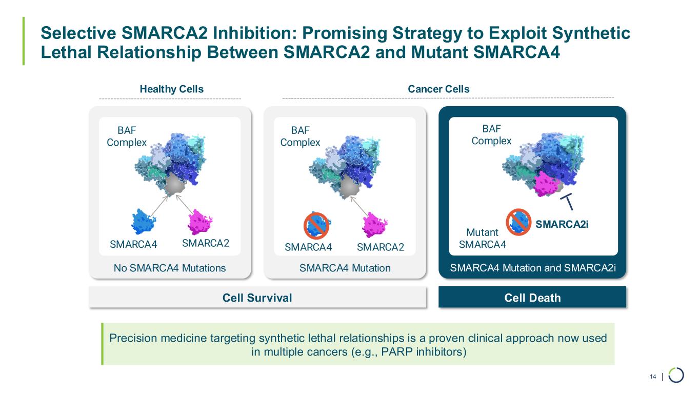| Selective SMARCA2 Inhibition: Promising Strategy to Exploit Synthetic Lethal Relationship Between SMARCA2 and Mutant SMARCA4 14 No SMARCA4 Mutations SMARCA4 Mutation SMARCA4 Mutation and SMARCA2i Cell Survival Cell Death Healthy Cells Cancer Cells SMARCA4 SMARCA2 BAF Complex BAF Complex Mutant SMARCA4 BAF Complex SMARCA2i Precision medicine targeting synthetic lethal relationships is a proven clinical approach now used in multiple cancers (e.g., PARP inhibitors) SMARCA4 SMARCA2