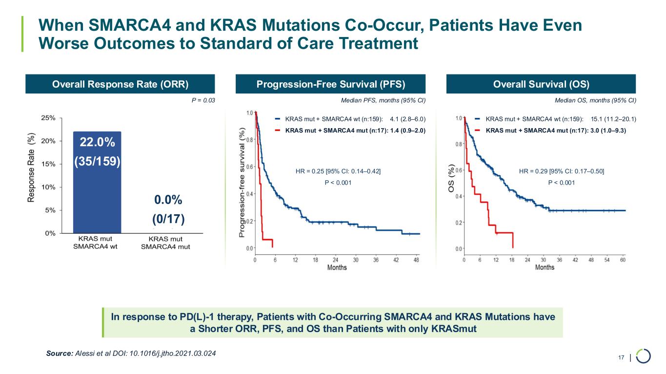 | NSCLC patients with SMARCA4 mutations: ─ Poor prognosis ─ Shorter overall survival ─ Less responsive to immune checkpoint inhibitors ─ Clinically definable, high unmet need population SMARCA4 Mutated in Up to 10% of NSCLC Tumors, Minimal Overlap With Other Mutations2 Overall Survival for SMARCA4wt vs SMARCA4mut1 SMARCA4 Mutations are Consequential – in NSCLC, Patients with Mutated SMARCA4 Have Significantly Worse Clinical Outcomes 16 SMARCA4 10% KRAS 29% EGFR 26% ALK 7% RET 4% MET 7% Source: 1. Alessi et al DOI: 10.1016/j.jtho.2023.01.091; 2. TCGA via cBioPortal O ve ra ll Su rv iv al (% ) Months Supporting references: • Gandhi, et al, 2025; DOI: 10.1016/j.jtho.2025.01.016 • Alessi, et al, 2023; DOI: 10.1016/j.jtho.2023.01.091 • Negrao, et al, 2023; DOI: 10.1158/2159-8290.Cd-22-1420 • Liu, et al, 2021; DOI: 10.1002/1878-0261.12831 • Fernando, et al, 2020; DOI: 10.1038/s41467-020-19402-8 • Schoenfeld, et al, 2020DOI: 10.1158/1078-0432.ccr-20-1825