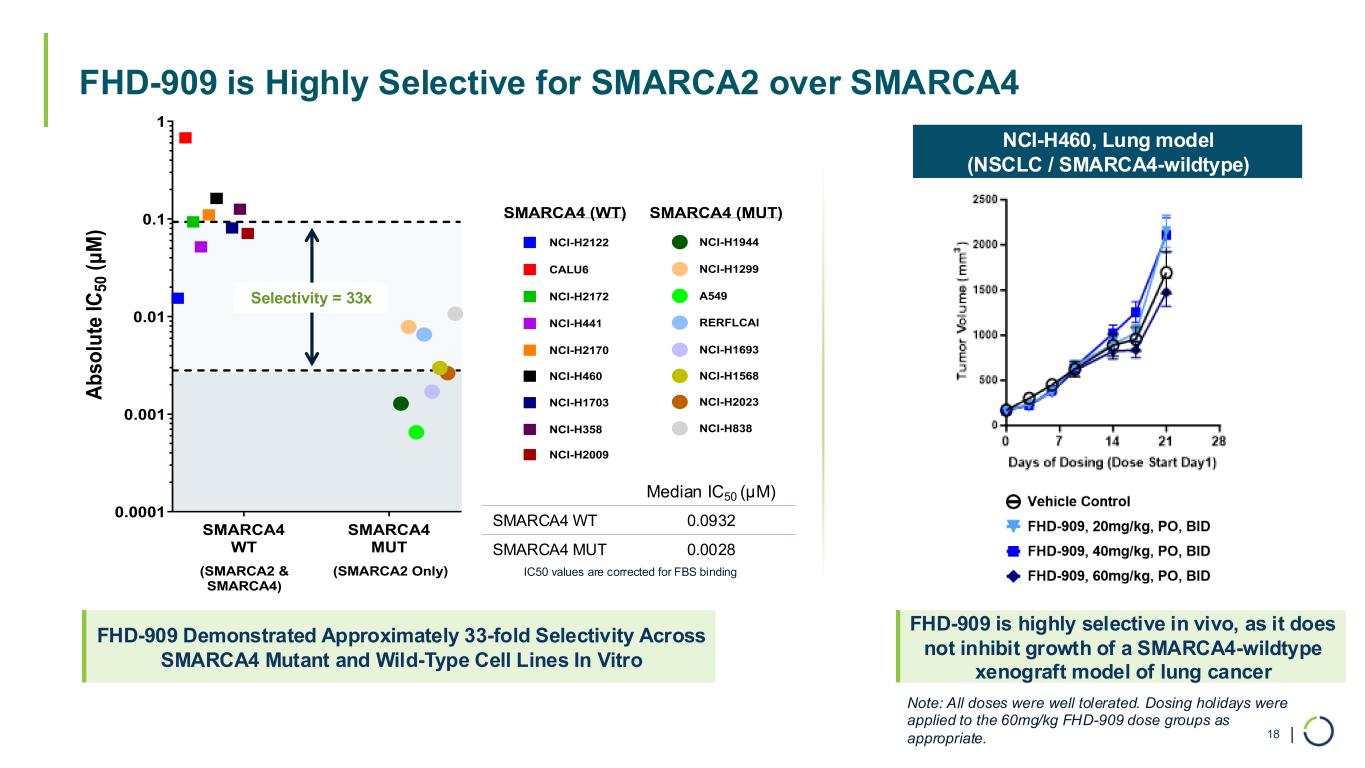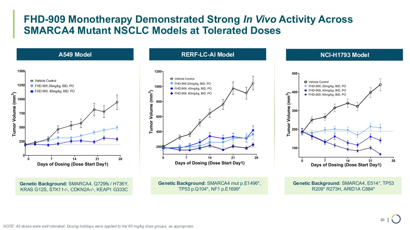 | FHD-909 Monotherapy Demonstrated Strong In Vivo Activity Across SMARCA4 Mutant NSCLC Models at Tolerated Doses 20 0 7 14 21 28 0 250 500 750 1000 1250 1500 Days of Dosing (Dose Start Day1) T u m o r V o lu m e ( m m 3 ) Vehicle Control 20mg/kg LY4050784, PO, BID 40mg/kg LY4050784, PO, BID 0 7 14 21 28 200 400 600 800 1000 1200 Days of Dosing (Dose Start Day1) T u m o r V o lu m e ( m m 3 ) Vehicle Control FHD-909 20mg/kg, BID, PO FHD-909, 40mg/kg, BID, PO FHD-909, 60mg/kg, BID, PO 0 7 14 21 28 100 200 300 400 500 Days of Dosing (Dose Start Day1) T u m o r V o lu m e ( m m 3 ) Vehicle Control FHD-909, 20mg/kg, BID, PO FHD-909, 40mg/kg, BID, PO FHD-909, 60mg/kg, BID, PO A549 Model RERF-LC-AI Model NCI-H1793 Model Genetic Background: SMARCA4, Q729fs / H736Y, KRAS G12S, STK11-/-, CDKN2A-/-, KEAP1 G333C Genetic Background: SMARCA4 mut p.E1496*, TP53 p.Q104*, NF1 p.E1699* Genetic Background: SMARCA4, E514*, TP53 R209* R273H, ARID1A C884* NOTE: All doses were well tolerated. Dosing holidays were applied to the 60 mg/kg dose groups, as appropriate.