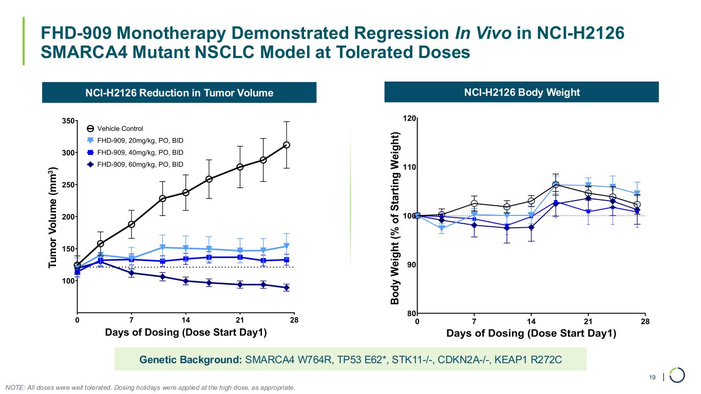 | FHD-909 is Highly Selective for SMARCA2 over SMARCA4 18 FHD-909 Demonstrated Approximately 33-fold Selectivity Across SMARCA4 Mutant and Wild-Type Cell Lines In Vitro SMARCA4 WT SMARCA4 MUT 0.0001 0.001 0.01 0.1 1 A b s o lu te I C 5 0 ( μ M ) NCI-H2122 CALU6 NCI-H2172 NCI-H441 NCI-H2170 NCI-H460 NCI-H1703 NCI-H358 NCI-H2009 NCI-H1944 NCI-H1299 A549 RERFLCAI NCI-H1693 NCI-H1568 NCI-H2023 NCI-H838 SMARCA4 (WT) SMARCA4 (MUT) (SMARCA2 Only)(SMARCA2 & SMARCA4) Selectivity = 33x Median IC50 (µM) SMARCA4 WT 0.0932 SMARCA4 MUT 0.0028 NCI-H460, Lung model (NSCLC / SMARCA4-wildtype) FHD-909 is highly selective in vivo, as it does not inhibit growth of a SMARCA4-wildtype xenograft model of lung cancer IC50 values are corrected for FBS binding Note: All doses were well tolerated. Dosing holidays were applied to the 60mg/kg FHD-909 dose groups as appropriate.