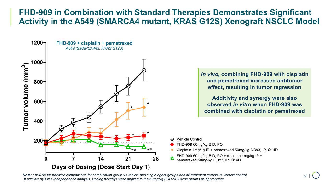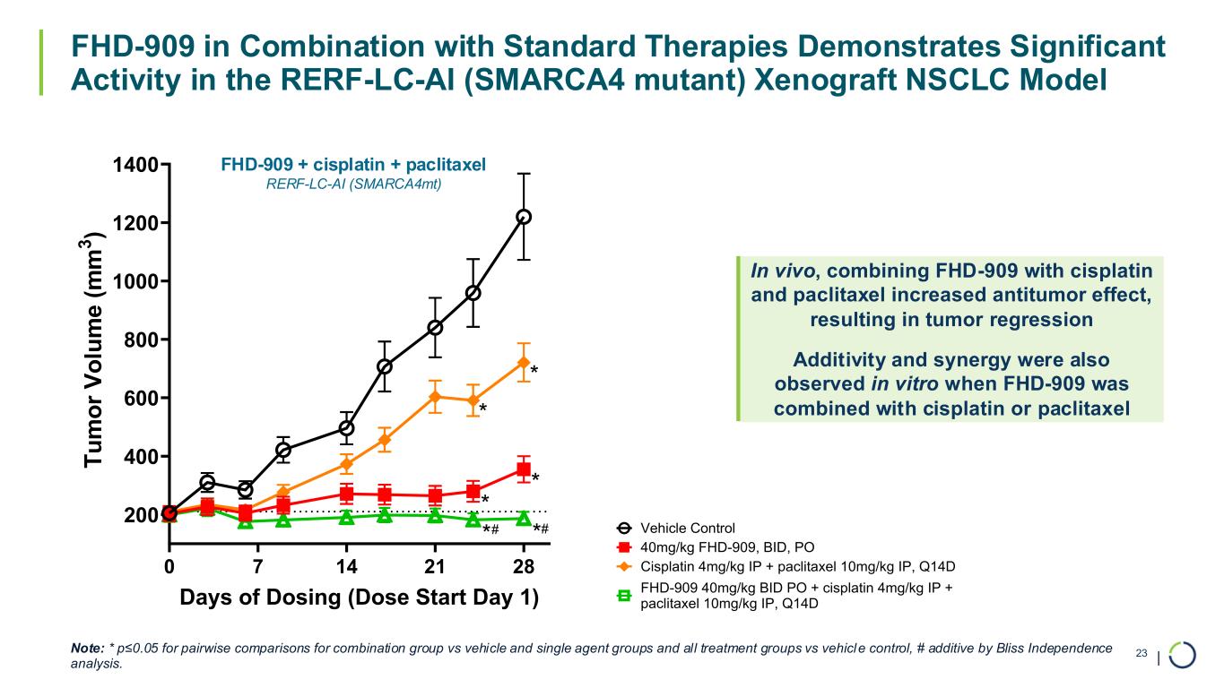 | FHD-909 in Combination with Standard Therapies Demonstrates Significant Activity in the A549 (SMARCA4 mutant, KRAS G12S) Xenograft NSCLC Model 22 Vehicle Control FHD-909 60mg/kg BID, PO Cisplatin 4mg/kg IP + pemetrexed 50mg/kg QDx3, IP, Q14D FHD-909 60mg/kg BID, PO + cisplatin 4mg/kg IP + pemetrexed 50mg/kg QDx3, IP, Q14D0 7 14 21 28 200 400 600 800 1000 1200 Days of Dosing (Dose Start Day 1) T u m o r v o lu m e ( m m 3 ) * * * * ** ## Note: * p≤0.05 for pairwise comparisons for combination group vs vehicle and single agent groups and all treatment groups vs vehicle control, # additive by Bliss Independence analysis. Dosing holidays were applied to the 60mg/kg FHD-909 dose groups as appropriate. FHD-909 + cisplatin + pemetrexed A549 (SMARCA4mt, KRAS G12S) In vivo, combining FHD-909 with cisplatin and pemetrexed increased antitumor effect, resulting in tumor regression Additivity and synergy were also observed in vitro when FHD-909 was combined with cisplatin or pemetrexed