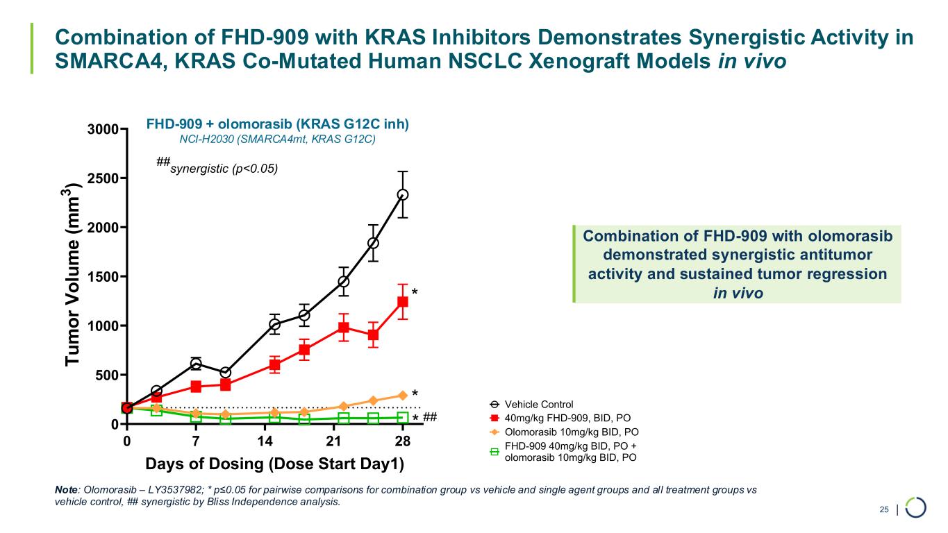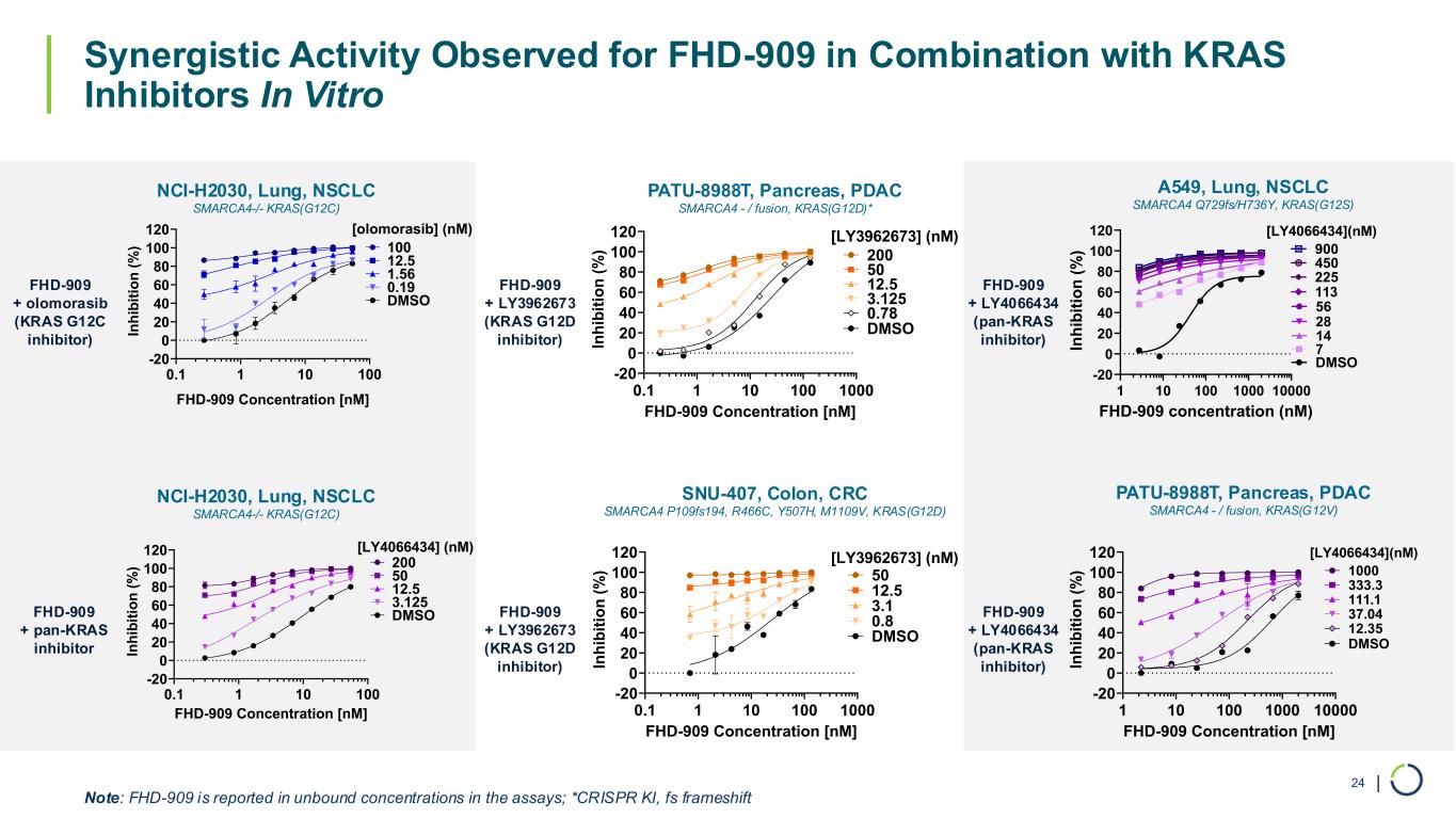| Synergistic Activity Observed for FHD-909 in Combination with KRAS Inhibitors In Vitro 24 0.1 1 10 100 -20 0 20 40 60 80 100 120 FHD-909 Concentration [nM] In h ib it io n ( % ) 12.5 1.56 0.19 DMSO [olomorasib] (nM) 100 0.1 1 10 100 -20 0 20 40 60 80 100 120 FHD-909 Concentration [nM] In h ib it io n ( % ) 50 12.5 3.125 DMSO [LY4066434] (nM) 200 FHD-909 + olomorasib (KRAS G12C inhibitor) FHD-909 + pan-KRAS inhibitor 0.1 1 10 100 1000 -20 0 20 40 60 80 100 120 FHD-909 Concentration [nM] In h ib it io n ( % ) 50 12.5 3.125 0.78 200 DMSO [LY3962673] (nM) 0.1 1 10 100 1000 -20 0 20 40 60 80 100 120 FHD-909 Concentration [nM] In h ib it io n ( % ) 12.5 3.1 0.8 DMSO 50 [LY3962673] (nM) 1 10 100 1000 10000 -20 0 20 40 60 80 100 120 FHD-909 concentration (nM) In h ib it io n ( % ) DMSO 7 14 28 56 113 225 450 900 [LY4066434](nM) 1 10 100 1000 10000 -20 0 20 40 60 80 100 120 FHD-909 Concentration [nM] In h ib it io n ( % ) 333.3 111.1 37.04 12.35 1000 DMSO [LY4066434](nM) NCI-H2030, Lung, NSCLC SMARCA4-/- KRAS(G12C) PATU-8988T, Pancreas, PDAC SMARCA4 - / fusion, KRAS(G12D)* SNU-407, Colon, CRC SMARCA4 P109fs194, R466C, Y507H, M1109V, KRAS(G12D) A549, Lung, NSCLC SMARCA4 Q729fs/H736Y, KRAS(G12S) PATU-8988T, Pancreas, PDAC SMARCA4 - / fusion, KRAS(G12V) Note: FHD-909 is reported in unbound concentrations in the assays; *CRISPR KI, fs frameshift FHD-909 + LY3962673 (KRAS G12D inhibitor) FHD-909 + LY4066434 (pan-KRAS inhibitor) FHD-909 + LY3962673 (KRAS G12D inhibitor) FHD-909 + LY4066434 (pan-KRAS inhibitor) NCI-H2030, Lung, NSCLC SMARCA4-/- KRAS(G12C)