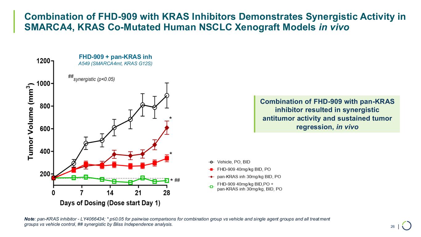 | Combination of FHD-909 with KRAS Inhibitors Demonstrates Synergistic Activity in SMARCA4, KRAS Co-Mutated Human NSCLC Xenograft Models in vivo FHD-909 + olomorasib (KRAS G12C inh) NCI-H2030 (SMARCA4mt, KRAS G12C) 25 Vehicle Control 40mg/kg FHD-909, BID, PO Olomorasib 10mg/kg BID, PO FHD-909 40mg/kg BID, PO + olomorasib 10mg/kg BID, PO 0 7 14 21 28 0 500 1000 1500 2000 2500 3000 Days of Dosing (Dose Start Day1) T u m o r V o lu m e ( m m 3 ) ## synergistic (p<0.05) * * * ## Combination of FHD-909 with olomorasib demonstrated synergistic antitumor activity and sustained tumor regression in vivo Note: Olomorasib – LY3537982; * p≤0.05 for pairwise comparisons for combination group vs vehicle and single agent groups and all treatment groups vs vehicle control, ## synergistic by Bliss Independence analysis.