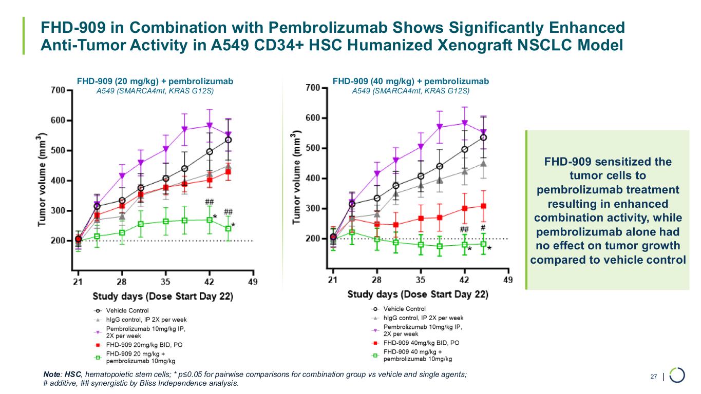 | FHD-909 in Combination with Pembrolizumab Shows Significantly Enhanced Anti-Tumor Activity in A549 CD34+ HSC Humanized Xenograft NSCLC Model 27 FHD-909 sensitized the tumor cells to pembrolizumab treatment resulting in enhanced combination activity, while pembrolizumab alone had no effect on tumor growth compared to vehicle control Note: HSC, hematopoietic stem cells; * p≤0.05 for pairwise comparisons for combination group vs vehicle and single agents; # additive, ## synergistic by Bliss Independence analysis. FHD-909 (20 mg/kg) + pembrolizumab A549 (SMARCA4mt, KRAS G12S) FHD-909 (40 mg/kg) + pembrolizumab A549 (SMARCA4mt, KRAS G12S)