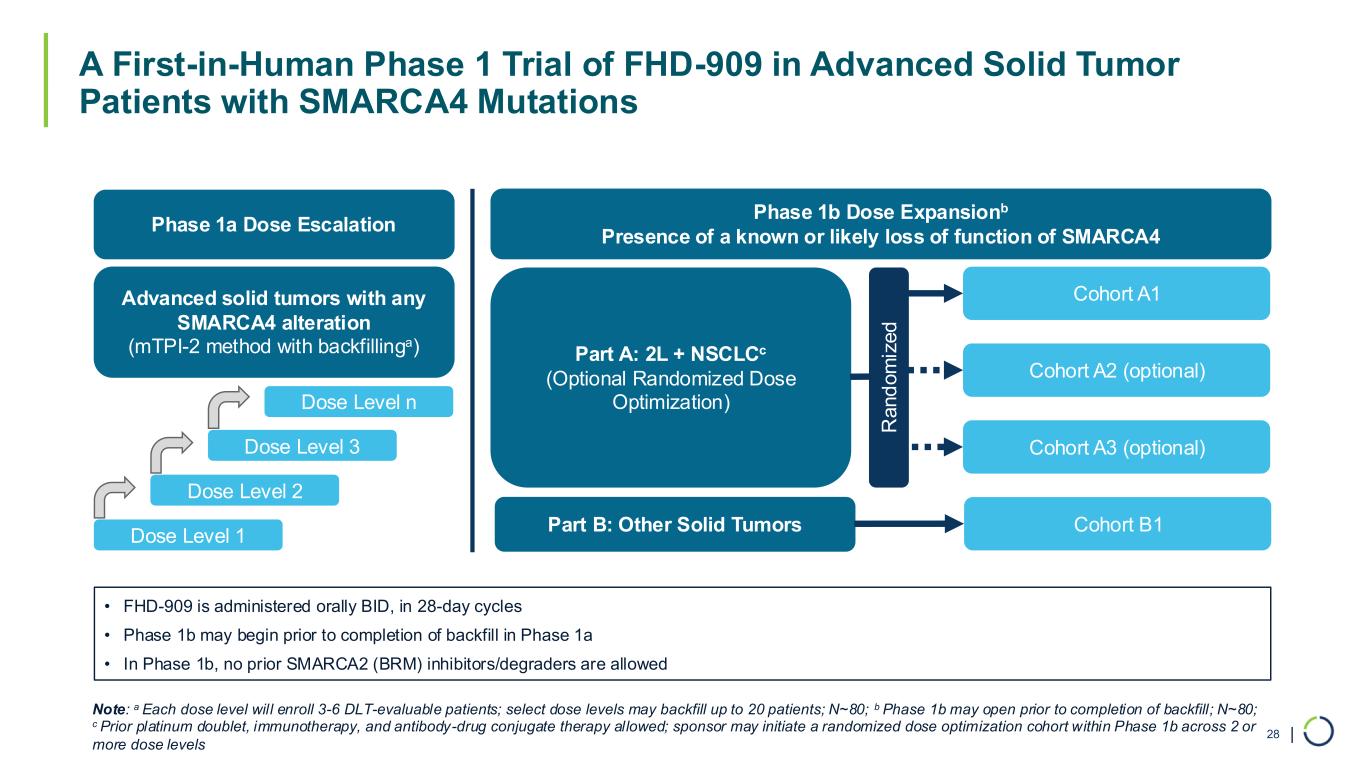 | A First-in-Human Phase 1 Trial of FHD-909 in Advanced Solid Tumor Patients with SMARCA4 Mutations Phase 1a Dose Escalation Advanced solid tumors with any SMARCA4 alteration (mTPI-2 method with backfillinga) Dose Level 1 Dose Level 2 Dose Level 3 Dose Level n Phase 1b Dose Expansionb Presence of a known or likely loss of function of SMARCA4 Part A: 2L + NSCLCc (Optional Randomized Dose Optimization) Part B: Other Solid Tumors Cohort A1 Cohort A2 (optional) Cohort A3 (optional) R a n d o m iz e d Cohort B1 • FHD-909 is administered orally BID, in 28-day cycles • Phase 1b may begin prior to completion of backfill in Phase 1a • In Phase 1b, no prior SMARCA2 (BRM) inhibitors/degraders are allowed Note: a Each dose level will enroll 3-6 DLT-evaluable patients; select dose levels may backfill up to 20 patients; N~80; b Phase 1b may open prior to completion of backfill; N~80; c Prior platinum doublet, immunotherapy, and antibody-drug conjugate therapy allowed; sponsor may initiate a randomized dose optimization cohort within Phase 1b across 2 or more dose levels 28