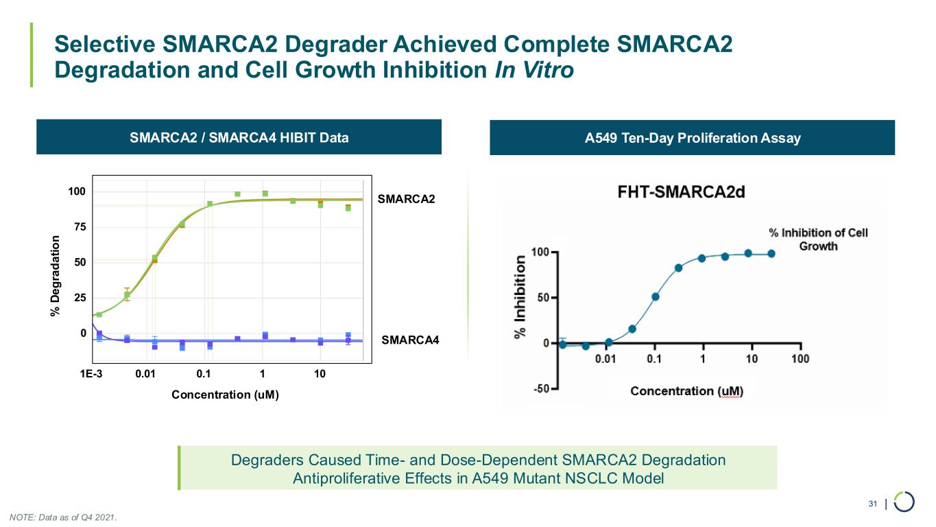 | Selective SMARCA2 Degrader Achieved Complete SMARCA2 Degradation and Cell Growth Inhibition In Vitro 31 Degraders Caused Time- and Dose-Dependent SMARCA2 Degradation Antiproliferative Effects in A549 Mutant NSCLC Model A549 Ten-Day Proliferation AssaySMARCA2 / SMARCA4 HIBIT Data SMARCA2 SMARCA4 % D e g ra d a ti o n Concentration (uM) 0 25 50 75 100 1E-3 0.01 0.1 1 10 NOTE: Data as of Q4 2021.