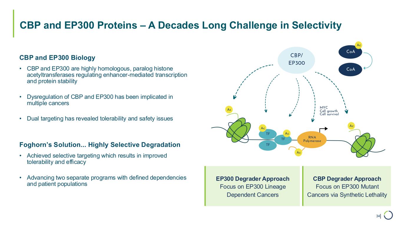 | CBP and EP300 Proteins – A Decades Long Challenge in Selectivity 34 CBP and EP300 Biology • CBP and EP300 are highly homologous, paralog histone acetyltransferases regulating enhancer-mediated transcription and protein stability • Dysregulation of CBP and EP300 has been implicated in multiple cancers • Dual targeting has revealed tolerability and safety issues Foghorn’s Solution... Highly Selective Degradation • Achieved selective targeting which results in improved tolerability and efficacy • Advancing two separate programs with defined dependencies and patient populations CoA TF TF TF RNA Polymerase Ac Ac CoA Ac Ac Ac CBP/ EP300 MYC Cell growth Cell survival Ac EP300 Degrader Approach Focus on EP300 Lineage Dependent Cancers CBP Degrader Approach Focus on EP300 Mutant Cancers via Synthetic Lethality