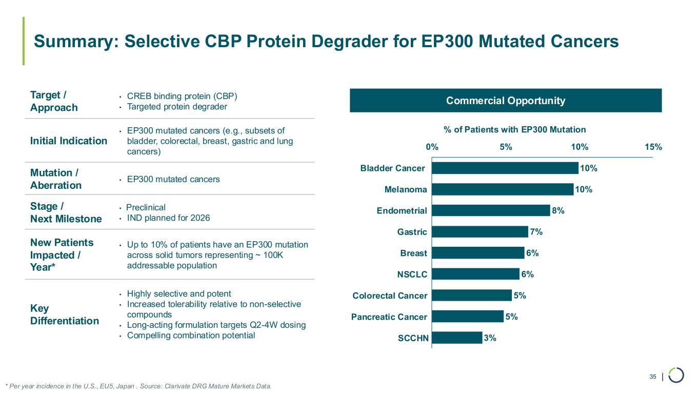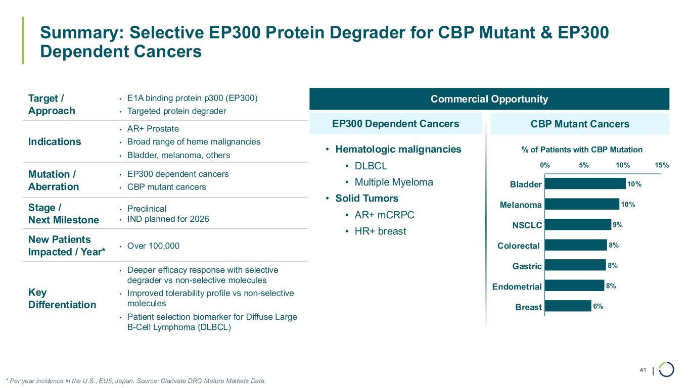 | Summary: Selective EP300 Protein Degrader for CBP Mutant & EP300 Dependent Cancers 41 * Per year incidence in the U.S., EU5, Japan. Source: Clarivate DRG Mature Markets Data. Target / Approach • E1A binding protein p300 (EP300) • Targeted protein degrader Indications • AR+ Prostate • Broad range of heme malignancies • Bladder, melanoma, others Mutation / Aberration • EP300 dependent cancers • CBP mutant cancers Stage / Next Milestone • Preclinical • IND planned for 2026 New Patients Impacted / Year* • Over 100,000 Key Differentiation • Deeper efficacy response with selective degrader vs non-selective molecules • Improved tolerability profile vs non-selective molecules • Patient selection biomarker for Diffuse Large B-Cell Lymphoma (DLBCL) Commercial Opportunity EP300 Dependent Cancers • Hematologic malignancies • DLBCL • Multiple Myeloma • Solid Tumors • AR+ mCRPC • HR+ breast CBP Mutant Cancers 10% 10% 9% 8% 8% 8% 6% 0% 5% 10% 15% Melanoma Bladder NSCLC Endometrial Colorectal Gastric Breast % of Patients with CBP Mutation