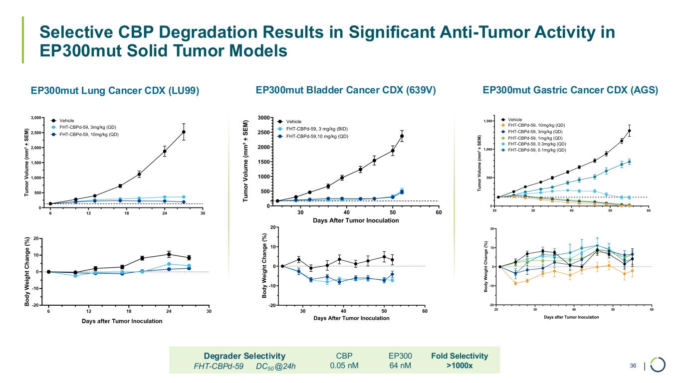 | EP300mut Lung Cancer CDX (LU99) EP300mut Bladder Cancer CDX (639V) EP300mut Gastric Cancer CDX (AGS) Selective CBP Degradation Results in Significant Anti-Tumor Activity in EP300mut Solid Tumor Models 36 CBP 0.05 nM EP300 64 nM Fold Selectivity >1000x Degrader Selectivity FHT-CBPd-59 DC50 @24h 20 30 40 50 60 -20 -10 0 10 20 B o d y W e ig h t C h a n g e ( % ) Vehicle FHT-CBPd - 9, 10mg/kg (QD) FHT-CBPd - 9, 3mg/kg (QD) FHT-CBPd - 9, 1mg/kg (QD) FHT-CBPd - 9, 0.3mg/kg (QD) FHT-CBPd - 9, 0.1mg/kg (QD) Days after Tumor Inoculation 6 12 18 24 30 0 500 1,000 1,500 2,000 2,500 3,000 T u m o r V o lu m e ( m m ³ + S E M ) Vehicle FHT-CBPd-59, 10mg/kg (QD) FHT-CBPd-59, 3mg/kg (QD) 30 40 50 60 0 500 1000 1500 2000 2500 3000 Days After Tumor Inoculation T u m o r V o lu m e ( m m ³ + S E M ) Vehicle FHT-CBPd-59, 3 mg/kg (BID) FHT-CBPd-59,10 mg/kg (QD) 30 40 50 60 -20 -10 0 10 20 Days After Tumor Inoculation B o d y W e ig h t C h a n g e ( % ) 20 30 40 50 60 0 500 1,000 1,500 Vehicle FHT-CBPd-59, 10mg/kg (QD) FHT-CBPd-59, 3mg/kg (QD) FHT-CBPd-59, 1mg/kg (QD) FHT-CBPd-59, 0.3mg/kg (QD) FHT-CBPd-59, 0.1mg/kg (QD) T u m o r V o lu m e ( m m ³ + S E M )