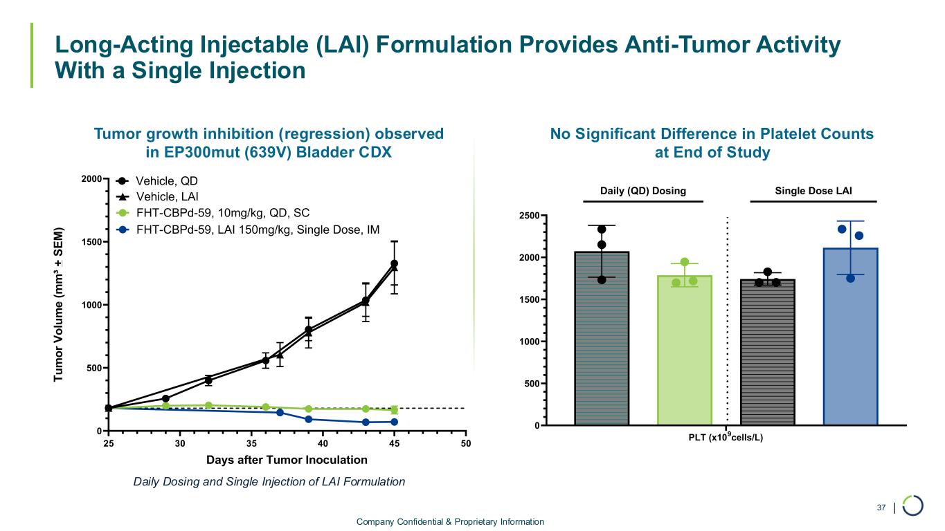 | No Significant Difference in Platelet Counts at End of Study Tumor growth inhibition (regression) observed in EP300mut (639V) Bladder CDX Long-Acting Injectable (LAI) Formulation Provides Anti-Tumor Activity With a Single Injection 37 Company Confidential & Proprietary Information 25 30 35 40 45 50 0 500 1000 1500 2000 Days after Tumor Inoculation T u m o r V o lu m e ( m m ³ + S E M ) Vehicle, LAI FHT-CBPd-59, LAI 150mg/kg, Single Dose, IM FHT-CBPd-59, 10mg/kg, QD, SC Vehicle, QD PLT (x10 9 cells/L) 0 500 1000 1500 2000 2500 Daily (QD) Dosing Single Dose LAI Daily Dosing and Single Injection of LAI Formulation