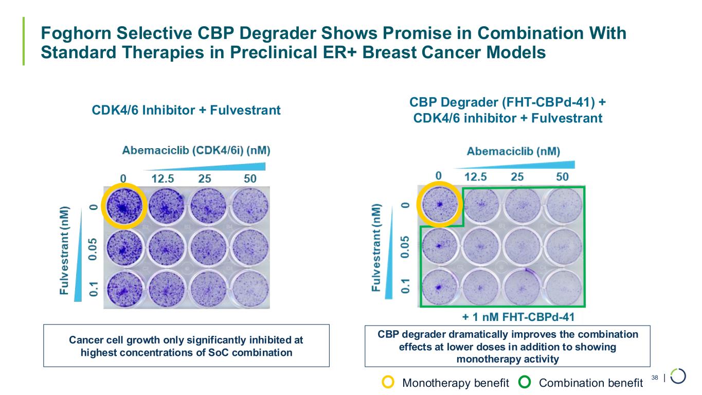 | Foghorn Selective CBP Degrader Shows Promise in Combination With Standard Therapies in Preclinical ER+ Breast Cancer Models 38 CDK4/6 Inhibitor + Fulvestrant CBP Degrader (FHT-CBPd-41) + CDK4/6 inhibitor + Fulvestrant Cancer cell growth only significantly inhibited at highest concentrations of SoC combination CBP degrader dramatically improves the combination effects at lower doses in addition to showing monotherapy activity Monotherapy benefit Combination benefit