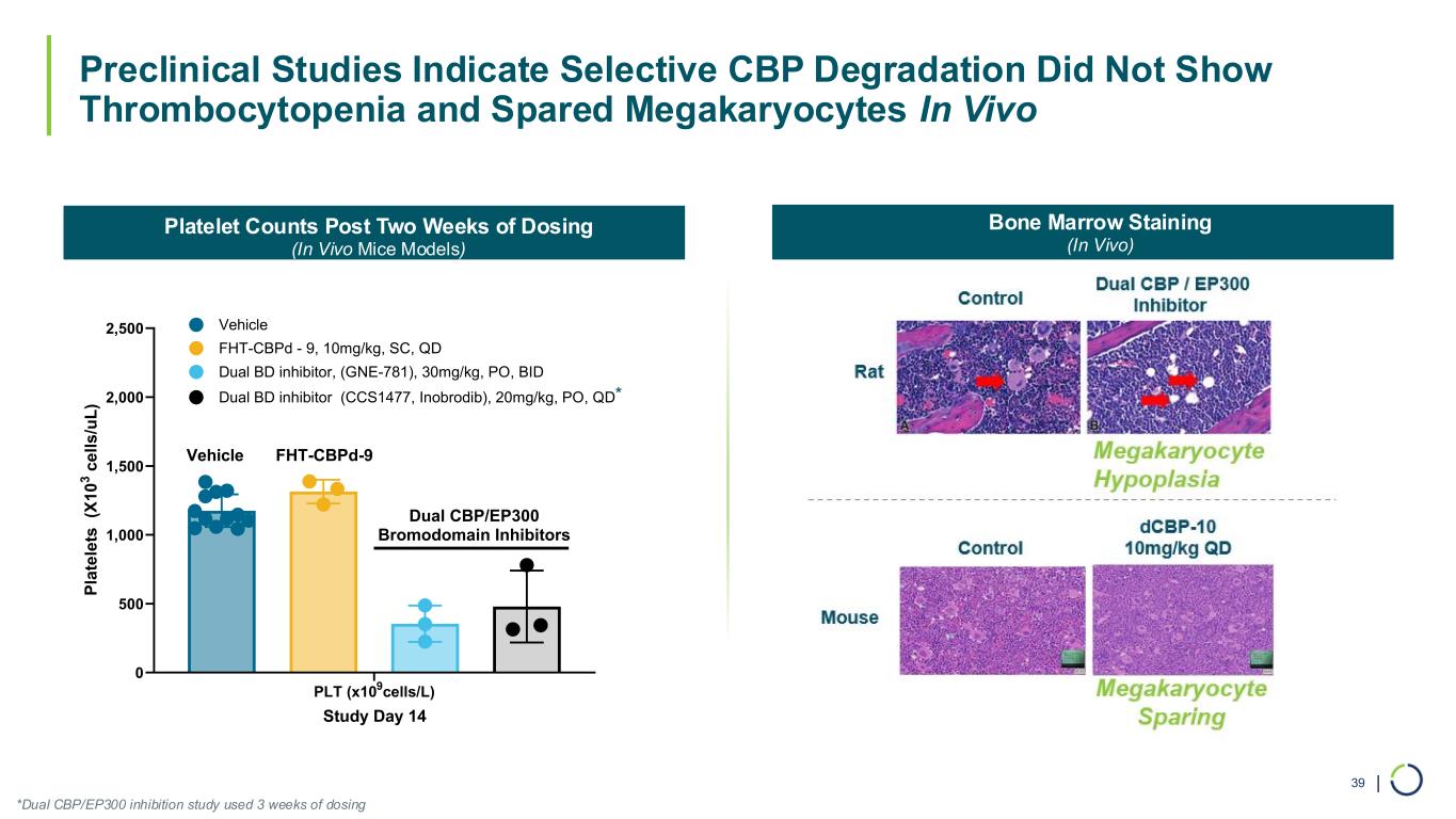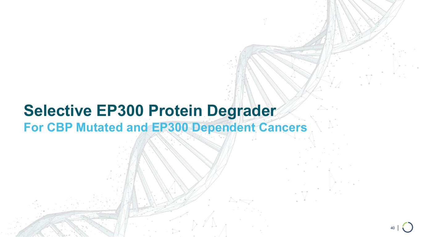 | Bone Marrow Staining (In Vivo) Platelet Counts Post Two Weeks of Dosing (In Vivo Mice Models) *Dual CBP/EP300 inhibition study used 3 weeks of dosing Preclinical Studies Indicate Selective CBP Degradation Did Not Show Thrombocytopenia and Spared Megakaryocytes In Vivo 39 PLT (x10 9 cells/L) 0 500 1,000 1,500 2,000 2,500 Study Day 14 P la te le ts (X 1 0 3 c e ll s /u L ) Vehicle FHT-CBPd - 9, 10mg/kg, SC, QD Dual BD inhibitor, (GNE-781), 30mg/kg, PO, BID FHT-CBPd-9 Dual CBP/EP300 Bromodomain Inhibitors Vehicle Dual BD inhibitor (CCS1477, Inobrodib), 20mg/kg, PO, QD*