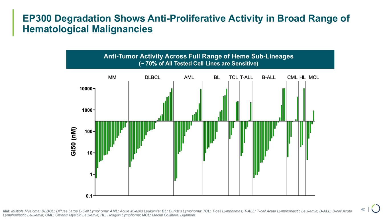 | Anti-Tumor Activity Across Full Range of Heme Sub-Lineages (~ 70% of All Tested Cell Lines are Sensitive) EP300 Degradation Shows Anti-Proliferative Activity in Broad Range of Hematological Malignancies 42 MM: Multiple Myeloma; DLBCL: Diffuse Large B-Cell Lymphoma; AML: Acute Myeloid Leukemia; BL: Burkitt’s Lymphoma; TCL: T-cell Lymphomas; T-ALL: T-cell Acute Lymphoblastic Leukemia; B-ALL: B-cell Acute Lymphoblastic Leukemia; CML: Chronic Myeloid Leukemia; HL: Hodgkin Lymphoma; MCL: Medial Collateral Ligament