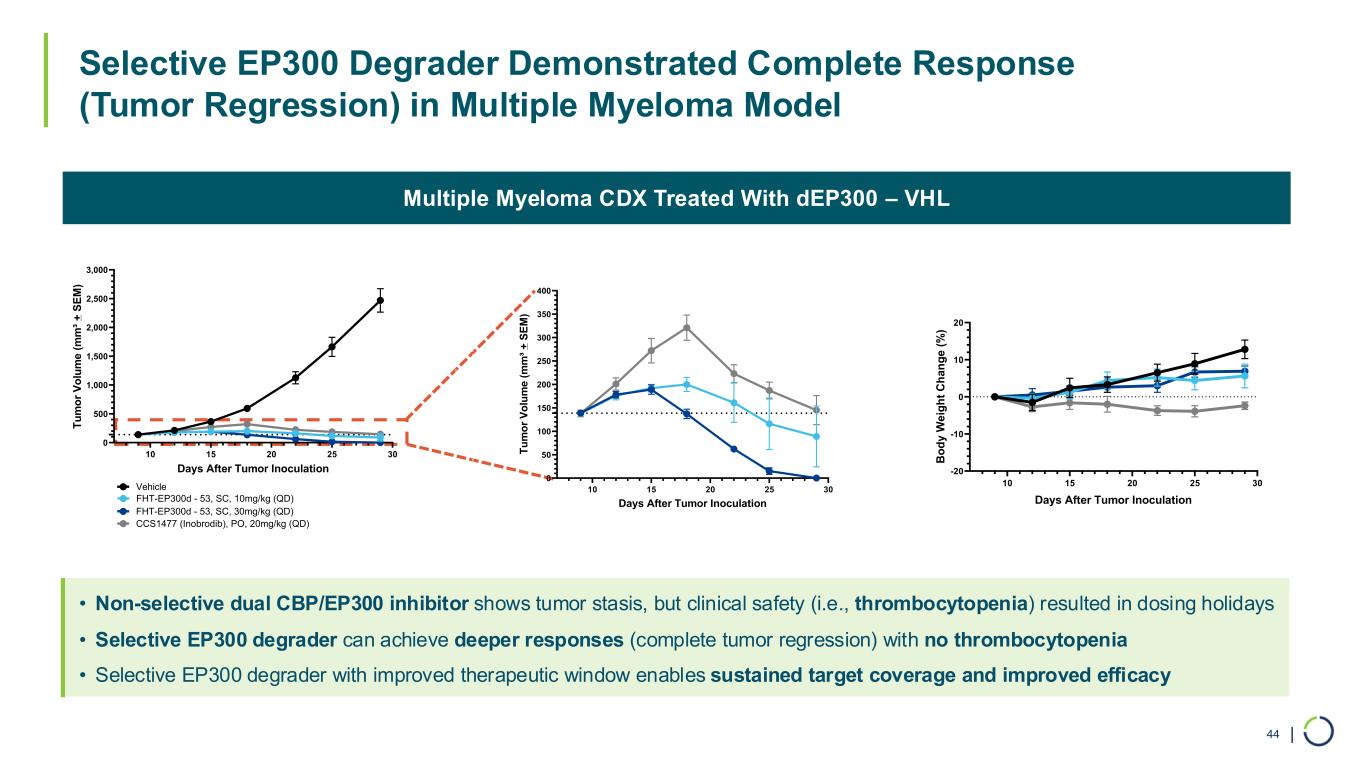 | Multiple Myeloma (MM1S) CDX DLBCL (KARPAS422) CDX AR+ Prostate (VCaP) CDX EP300 Degradation Results in Significant Tumor Growth Inhibition in Multiple Myeloma, DLBCL and Prostate Models 43 10 20 30 40 50 0 500 1,000 1,500 2,000 Vehicle FHT-EP300d - 32, SC, 50mg/kg (BID) Enzalutamide, PO, 30mg/kg (QD) T u m o r V o lu m e ( m m ³ + S E M ) Days After Tumor Inoculation 10 20 30 40 50 -20 -10 0 10 20 Days After Tumor Inoculation B o d y W e ig h t C h a n g e ( % ) 5 10 15 20 25 30 35 40 45 0 500 1,000 1,500 2,000 Vehicle FHT-EP300d - 32, SC, 50mg/kg (BID) Days After Tumor Inoculation FHT-EP300d - 32, SC, 20mg/kg (BID) FHT-EP300d - 32, SC, 10mg/kg (BID) T u m o r V o lu m e ( m m ³ + S E M ) 10 15 20 25 30 -20 -10 0 10 20 Days After Tumor Inoculation B o d y W e ig h t C h a n g e ( % ) 10 15 20 25 30 0 500 1,000 1,500 2,000 2,500 3,000 Days After Tumor Inoculation T u m o r V o lu m e ( m m ³ + S E M ) Vehicle FHT-EP300d - 53, SC, 30mg/kg (QD) FHT-EP300d - 53, SC, 10mg/kg (QD) CCS1477 (Inobrodib), PO, 20mg/kg (QD) CBP >1 uM EP300 0.7 nM Fold Selectivity >1000x Degrader Selectivity FHT-EP300d-53 DC50 @24h CBP >1 uM EP300 23 nM Fold Selectivity >40x Degrader Selectivity FHT-EP300d-32 DC50 @24h