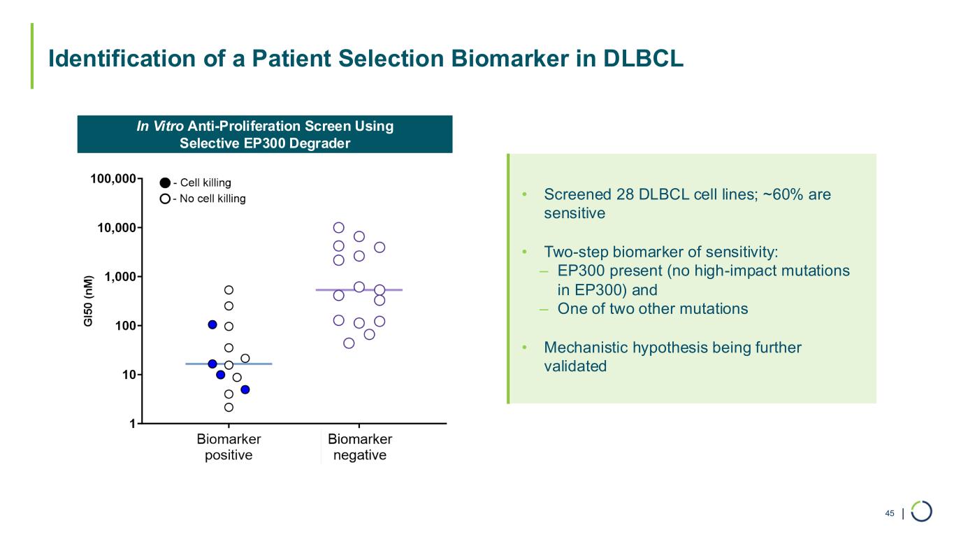 | Identification of a Patient Selection Biomarker in DLBCL • Screened 28 DLBCL cell lines; ~60% are sensitive • Two-step biomarker of sensitivity: ‒ EP300 present (no high-impact mutations in EP300) and ‒ One of two other mutations • Mechanistic hypothesis being further validated In Vitro Anti-Proliferation Screen Using Selective EP300 Degrader 45