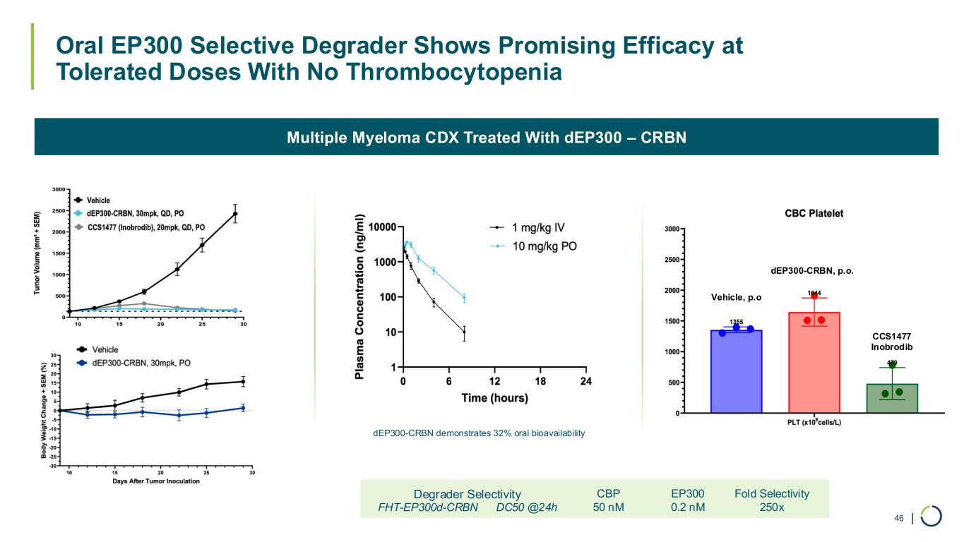 | • Non-selective dual CBP/EP300 inhibitor shows tumor stasis, but clinical safety (i.e., thrombocytopenia) resulted in dosing holidays • Selective EP300 degrader can achieve deeper responses (complete tumor regression) with no thrombocytopenia • Selective EP300 degrader with improved therapeutic window enables sustained target coverage and improved efficacy Multiple Myeloma CDX treated w/ dEP300 - VHL Multiple Myeloma CDX treated w/ dEP300 - HL Selective EP300 Degrader Demonstrated Complete Response (Tumor Regression) in Multiple Myeloma Model 44 10 15 20 25 30 0 500 1,000 1,500 2,000 2,500 3,000 Days After Tumor Inoculation T u m o r V o lu m e ( m m ³ + S E M ) Vehicle FHT-EP300d - 53, SC, 30mg/kg (QD) FHT-EP300d - 53, SC, 10mg/kg (QD) CCS1477 (Inobrodib), PO, 20mg/kg (QD) 10 15 20 25 30 -20 -10 0 10 20 Days After Tumor Inoculation B o d y W e ig h t C h a n g e ( % ) 10 15 20 25 30 0 50 100 150 200 250 300 350 400 Days After Tumor Inoculation T u m o r V o lu m e ( m m ³ + S E M ) FHT-90532, 30mpk, QDx21, SC (ΔTGI=106.0%) FHT-90532, 10mpk, QDx21, SC (ΔTGI=102.1%) CCS1477 (Inobrodib), 20mpk, QDx21, PO (ΔTGI=99.7%) Multiple Myeloma CDX Treated With dEP300 – VHL