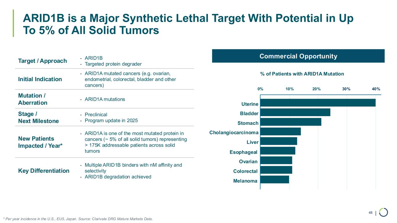 | ARID1B is a Major Synthetic Lethal Target With Potential in Up To 5% of All Solid Tumors 48 * Per year incidence in the U.S., EU5, Japan. Source: Clarivate DRG Mature Markets Data. Target / Approach • ARID1B • Targeted protein degrader Initial Indication • ARID1A mutated cancers (e.g. ovarian, endometrial, colorectal, bladder and other cancers) Mutation / Aberration • ARID1A mutations Stage / Next Milestone • Preclinical • Program update in 2025 New Patients Impacted / Year* • ARID1A is one of the most mutated protein in cancers (~ 5% of all solid tumors) representing > 175K addressable patients across solid tumors Key Differentiation • Multiple ARID1B binders with nM affinity and selectivity • ARID1B degradation achieved Uterine Bladder Stomach Cholangiocarcinoma Liver Esophageal Ovarian Colorectal Melanoma 0% 10% 20% 30% 40% Commercial Opportunity % of Patients with ARID1A Mutation