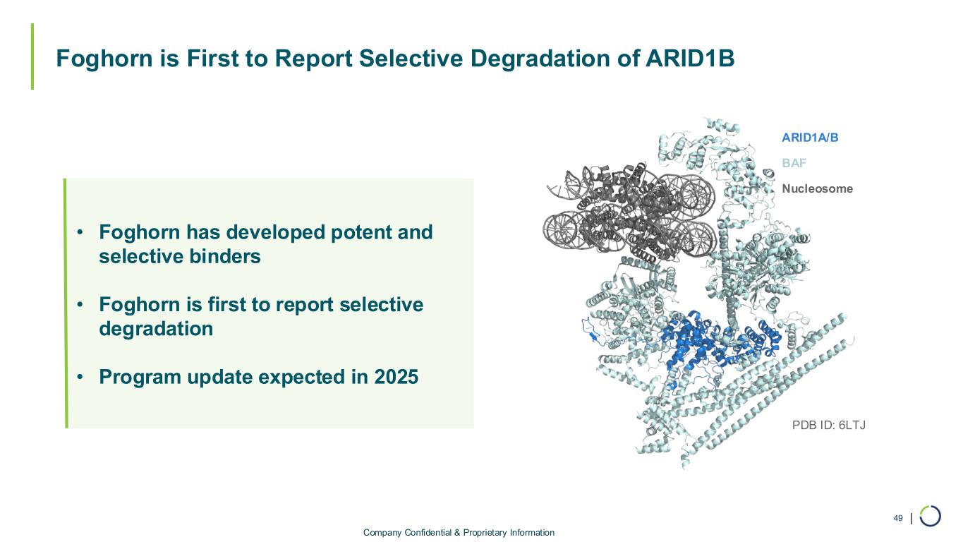 | Foghorn is First to Report Selective Degradation of ARID1B 49 ARID1A/B BAF Nucleosome PDB ID: 6LTJ Company Confidential & Proprietary Information • Foghorn has developed potent and selective binders • Foghorn is first to report selective degradation • Program update expected in 2025