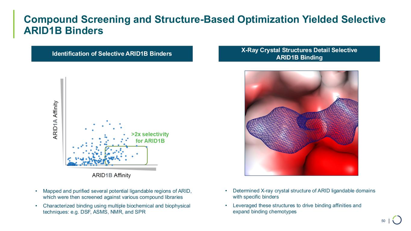 | Compound Screening and Structure-Based Optimization Yielded Selective ARID1B Binders 50 • Mapped and purified several potential ligandable regions of ARID, which were then screened against various compound libraries • Characterized binding using multiple biochemical and biophysical techniques: e.g. DSF, ASMS, NMR, and SPR • Determined X-ray crystal structure of ARID ligandable domains with specific binders • Leveraged these structures to drive binding affinities and expand binding chemotypes Identification of Selective ARID1B Binders X-Ray Crystal Structures Detail Selective ARID1B Binding