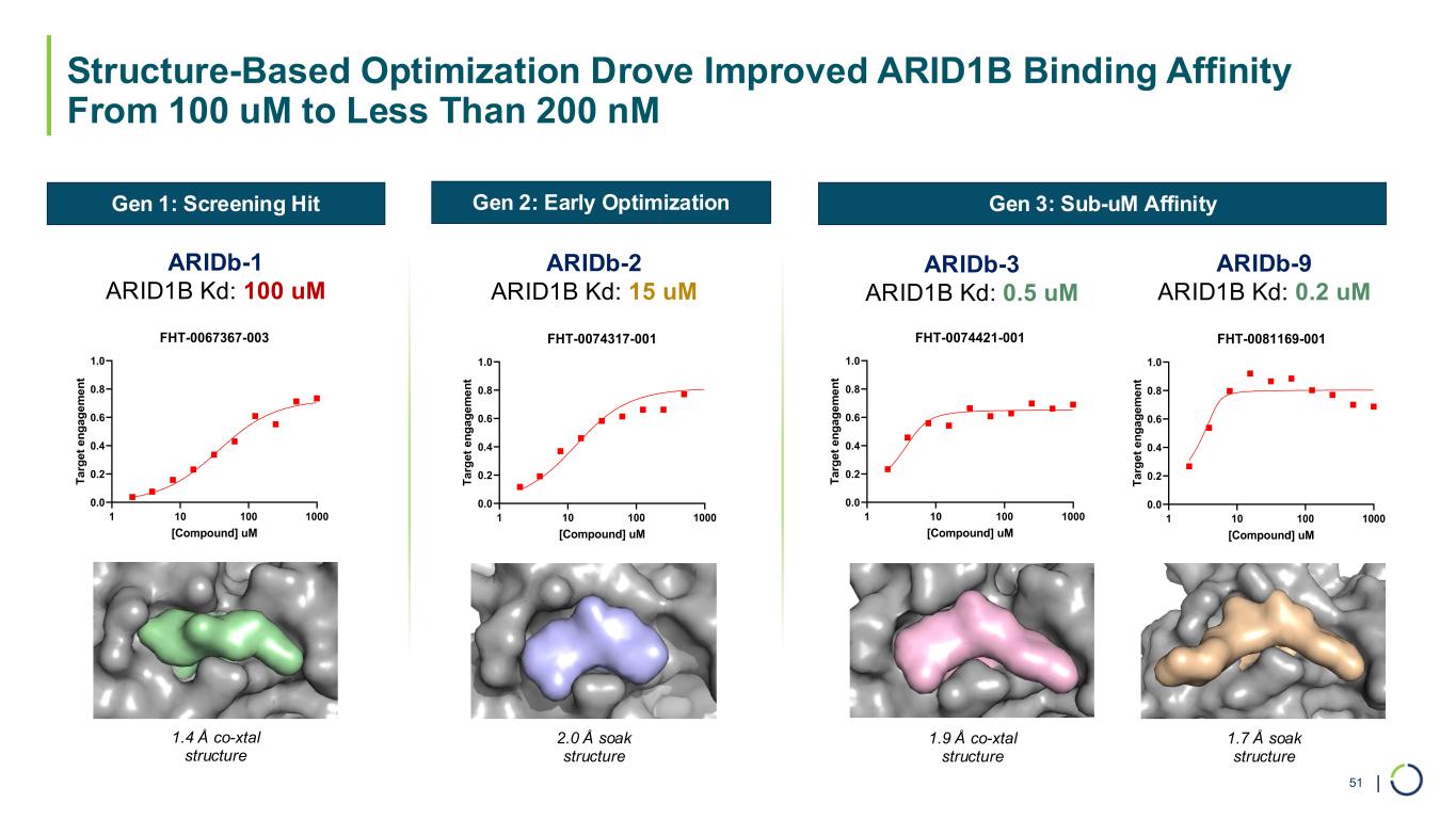 | Structure-Based Optimization Drove Improved ARID1B Binding Affinity From 100 uM to Less Than 200 nM 51 1.4 Å co-xtal structure 2.0 Å soak structure 1.7 Å soak structure ARIDb-2 ARID1B Kd: 15 uM ARIDb-1 ARID1B Kd: 100 uM ARIDb-3 ARID1B Kd: 0.5 uM ARIDb-9 ARID1B Kd: 0.2 uM 1.9 Å co-xtal structure 1 10 100 1000 0.0 0.2 0.4 0.6 0.8 1.0 FHT-0074317-001 [Compound] uM T a rg e t e n g a g e m e n t 1 10 100 1000 0.0 0.2 0.4 0.6 0.8 1.0 FHT-0074421-001 [Compound] uM T a rg e t e n g a g e m e n t 1 10 100 1000 0.0 0.2 0.4 0.6 0.8 1.0 FHT-0081169-001 [Compound] uM T a rg e t e n g a g e m e n t 1 10 100 1000 0.0 0.2 0.4 0.6 0.8 1.0 FHT-0067367-003 [Compound] uM T a rg e t e n g a g e m e n t Gen 1: Screening Hit Gen 2: Early Optimization Gen 3: Sub-uM Affinity