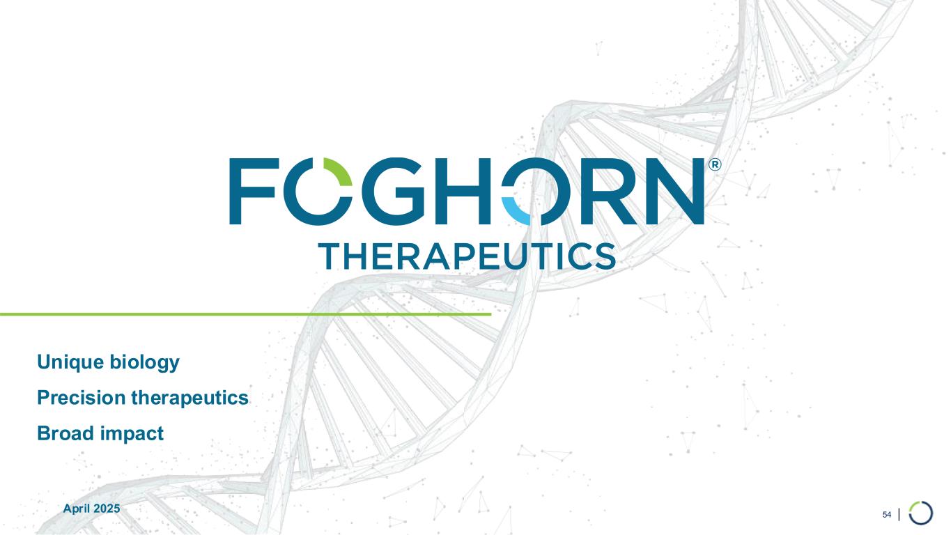 | Developing First-in-Class Precision Medicines Targeting Major Unmet Needs in Cancer 53 Large Market Potential Chromatin biology is implicated in up to 50% of tumors, potentially impacting ~2.5 million patients Foghorn’s current pipeline potentially addresses more than 500,000 of these patients Broad pipeline across a range of targets and small molecule modalities Major Strategic Collaboration Strategic collaboration with Lilly; $380 million upfront; 50/50 U.S. economic split on two lead programs Well- Funded $243.7 million in cash and equivalents (as of 12/31/2024) Cash runway into 2027 Shares outstanding: approximately 62.5M* Value Drivers Selective SMARCA2 Inhibitor, FHD-909, partnered with Lilly, in Phase 1 trial Advancement of preclinical assets (Selective SMARCA2 Degrader, CBP, EP300, ARID1B) towards INDs Protein degrader platform with expansion into induced proximity Leader in Unique Area of Cancer Biology Foghorn is a leader in targeting chromatin biology, which has the potential to address underlying dependencies of many genetically defined cancers Platform with initial focus in oncology, therapeutic area expansion potential *Includes common shares outstanding and pre-funded warrants as of 12/31/2024.