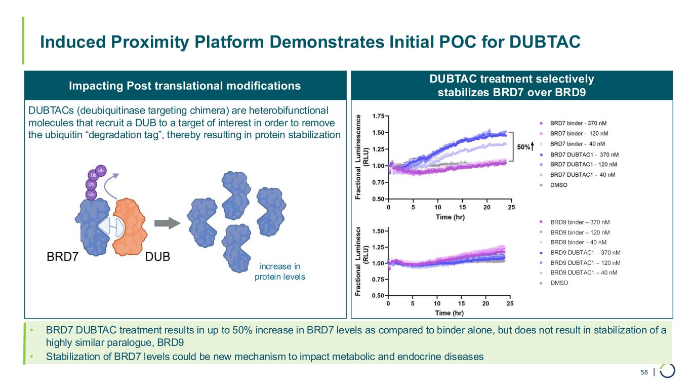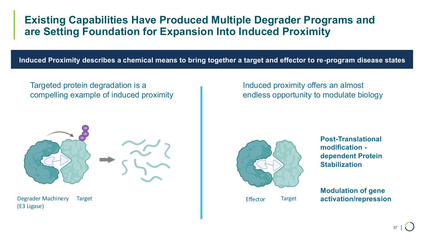 | Existing Capabilities Have Produced Multiple Degrader Programs and are Setting Foundation for Expansion Into Induced Proximity 57 TargetDegrader Machinery (E3 Ligase) TargetEffector Post-Translational modification - dependent Protein Stabilization Modulation of gene activation/repression Induced Proximity describes a chemical means to bring together a target and effector to re-program disease states Targeted protein degradation is a compelling example of induced proximity Induced proximity offers an almost endless opportunity to modulate biology