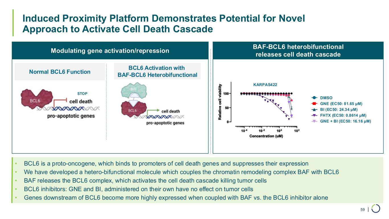 | Induced Proximity Platform Demonstrates Potential for Novel Approach to Activate Cell Death Cascade 59 Normal BCL6 Function BCL6 Activation with BAF-BCL6 Heterobifunctional • BCL6 is a proto-oncogene, which binds to promoters of cell death genes and suppresses their expression • We have developed a hetero-bifunctional molecule which couples the chromatin remodeling complex BAF with BCL6 • BAF releases the BCL6 complex, which activates the cell death cascade killing tumor cells • BCL6 inhibitors: GNE and BI, administered on their own have no effect on tumor cells • Genes downstream of BCL6 become more highly expressed when coupled with BAF vs. the BCL6 inhibitor alone STOP DMSO GNE (EC50: 81.65 μM) BI (EC50: 24.34 μM) FHTX (EC50: 0.8614 μM) GNE + BI (EC50: 16.16 μM) KARPAS422 Modulating gene activation/repression BAF-BCL6 heterobifunctional releases cell death cascade