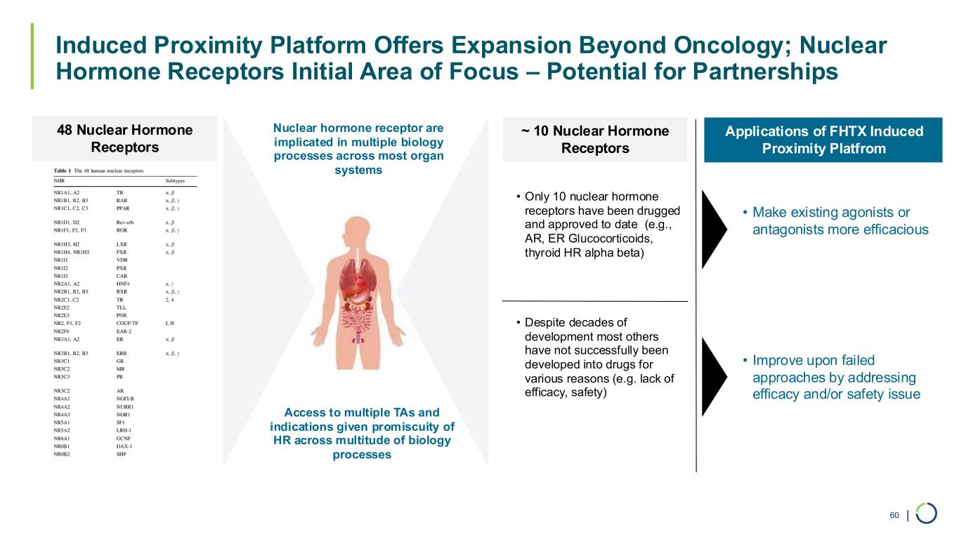 | 48 Nuclear Hormone Receptors Nuclear hormone receptor are implicated in multiple biology processes across most organ systems • Only 10 nuclear hormone receptors have been drugged and approved to date (e.g., AR, ER Glucocorticoids, thyroid HR alpha beta) • Despite decades of development most others have not successfully been developed into drugs for various reasons (e.g. lack of efficacy, safety) • Make existing agonists or antagonists more efficacious • Improve upon failed approaches by addressing efficacy and/or safety issue ~ 10 Nuclear Hormone Receptors Applications of FHTX Induced Proximity Platfrom Access to multiple TAs and indications given promiscuity of HR across multitude of biology processes Induced Proximity Platform Offers Expansion Beyond Oncology; Nuclear Hormone Receptors Initial Area of Focus – Potential for Partnerships 60