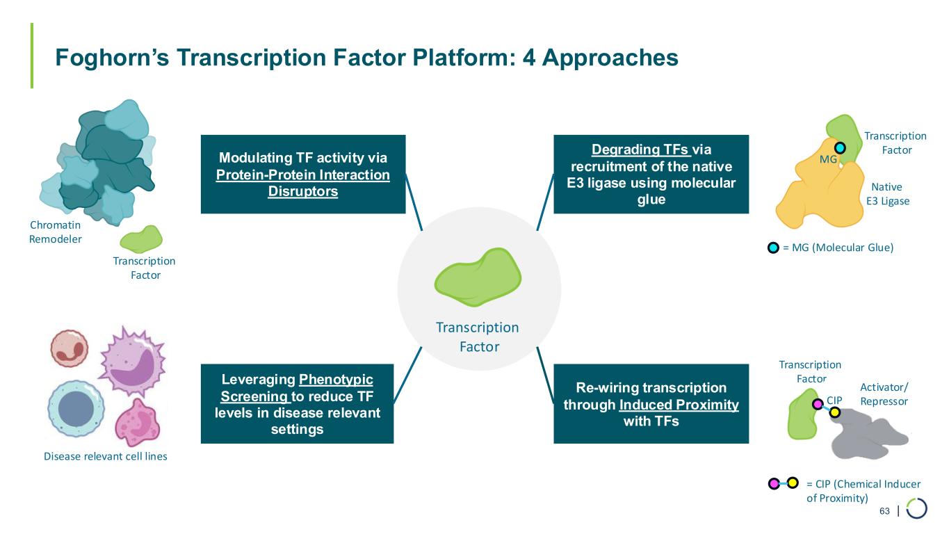 | Foghorn’s Transcription Factor Platform: 4 Approaches 63 Transcription Factor Chromatin Remodeler Modulating TF activity via Protein-Protein Interaction Disruptors Transcription Factor Native E3 Ligase Degrading TFs via recruitment of the native E3 ligase using molecular glue = MG (Molecular Glue) Leveraging Phenotypic Screening to reduce TF levels in disease relevant settings Re-wiring transcription through Induced Proximity with TFs Disease relevant cell lines Transcription Factor Activator/ Repressor = CIP (Chemical Inducer of Proximity) CIP MG Transcription Factor