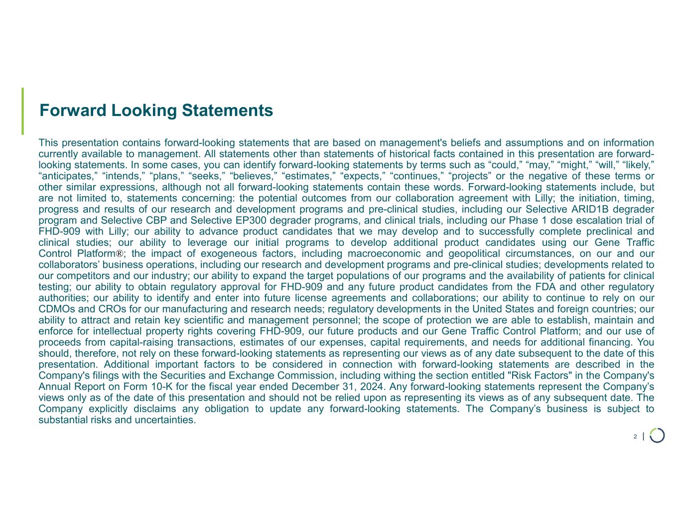 | Forward Looking Statements 2 This presentation contains forward-looking statements that are based on management's beliefs and assumptions and on information currently available to management. All statements other than statements of historical facts contained in this presentation are forward- looking statements. In some cases, you can identify forward-looking statements by terms such as “could,” “may,” “might,” “will,” “likely,” “anticipates,” “intends,” “plans,” “seeks,” “believes,” “estimates,” “expects,” “continues,” “projects” or the negative of these terms or other similar expressions, although not all forward-looking statements contain these words. Forward-looking statements include, but are not limited to, statements concerning: the potential outcomes from our collaboration agreement with Lilly; the initiation, timing, progress and results of our research and development programs and pre-clinical studies, including our Selective ARID1B degrader program and Selective CBP and Selective EP300 degrader programs, and clinical trials, including our Phase 1 dose escalation trial of FHD-909 with Lilly; our ability to advance product candidates that we may develop and to successfully complete preclinical and clinical studies; our ability to leverage our initial programs to develop additional product candidates using our Gene Traffic Control Platform®; the impact of exogeneous factors, including macroeconomic and geopolitical circumstances, on our and our collaborators’ business operations, including our research and development programs and pre-clinical studies; developments related to our competitors and our industry; our ability to expand the target populations of our programs and the availability of patients for clinical testing; our ability to obtain regulatory approval for FHD-909 and any future product candidates from the FDA and other regulatory authorities; our ability to identify and enter into future license agreements and collaborations; our ability to continue to rely on our CDMOs and CROs for our manufacturing and research needs; regulatory developments in the United States and foreign countries; our ability to attract and retain key scientific and management personnel; the scope of protection we are able to establish, maintain and enforce for intellectual property rights covering FHD-909, our future products and our Gene Traffic Control Platform; and our use of proceeds from capital-raising transactions, estimates of our expenses, capital requirements, and needs for additional financing. You should, therefore, not rely on these forward-looking statements as representing our views as of any date subsequent to the date of this presentation. Additional important factors to be considered in connection with forward-looking statements are described in the Company's filings with the Securities and Exchange Commission, including withing the section entitled "Risk Factors" in the Company's Annual Report on Form 10-K for the fiscal year ended December 31, 2024. Any forward-looking statements represent the Company’s views only as of the date of this presentation and should not be relied upon as representing its views as of any subsequent date. The Company explicitly disclaims any obligation to update any forward-looking statements. The Company’s business is subject to substantial risks and uncertainties.